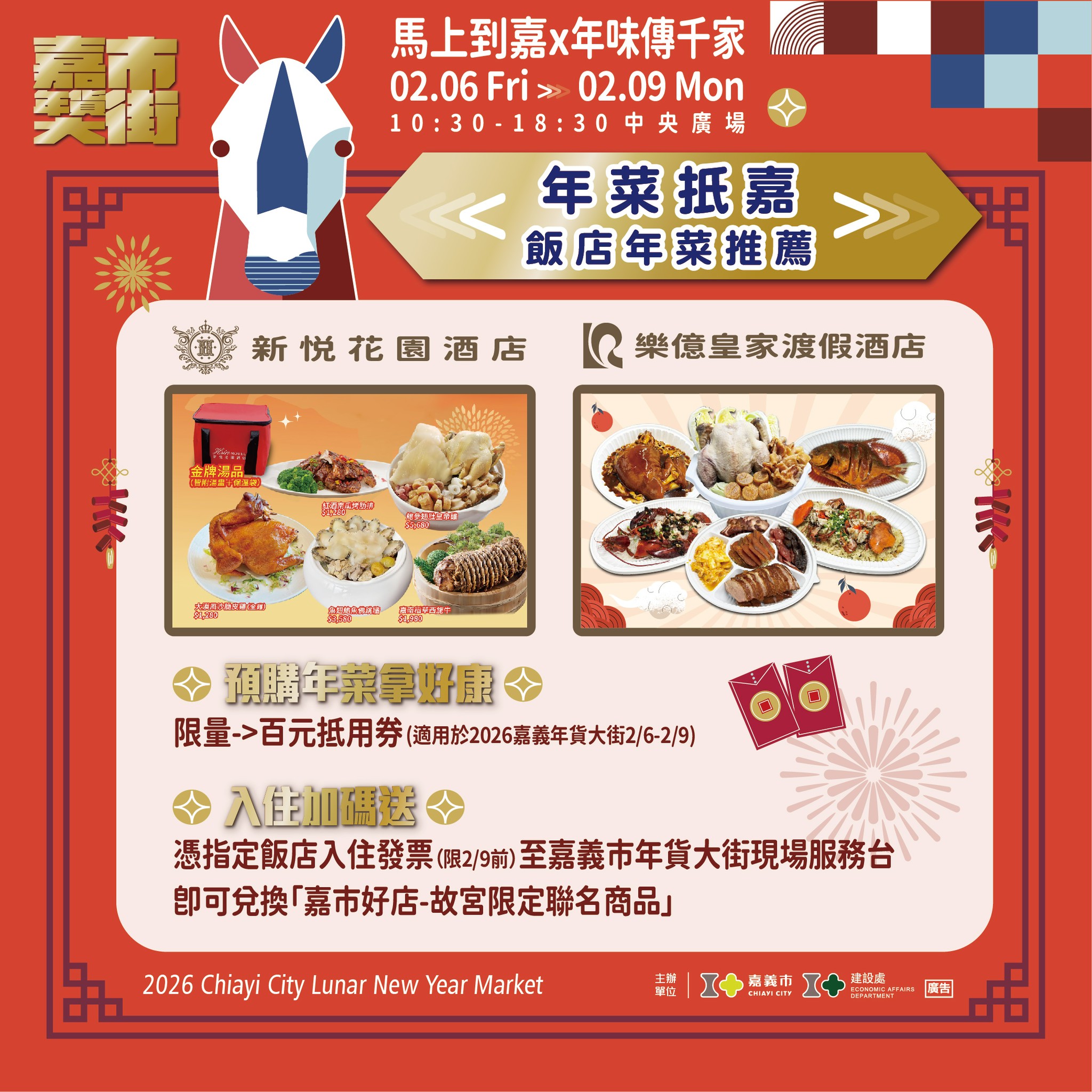 春節將近,嘉義市將在中央廣場辦理「馬上到嘉x年味傳千家」年貨大街,不僅販售多樣優惠商品,還會發放福袋、開運紅包和春聯等,可以來現場領取。特別是現在預購年菜,還有機會獲得 100 元抵用券,並可於當天使用。