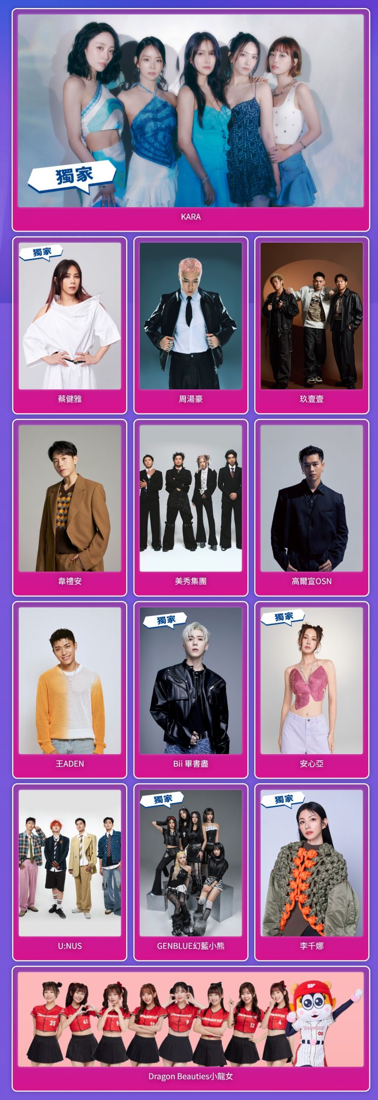 今年台北跨年晚會卡司有畢書盡、高爾宣OSN、幻藍小熊、U:NUS、 王ADEN、韋禮安、蔡健雅、李千娜、美秀集團、周湯豪、玖壹壹、安心亞、KARA、Dragon Beauties小龍女,集結情歌王子、新生代女團、饒舌歌手、人氣男團、韓國女團,陣容已全部公佈。