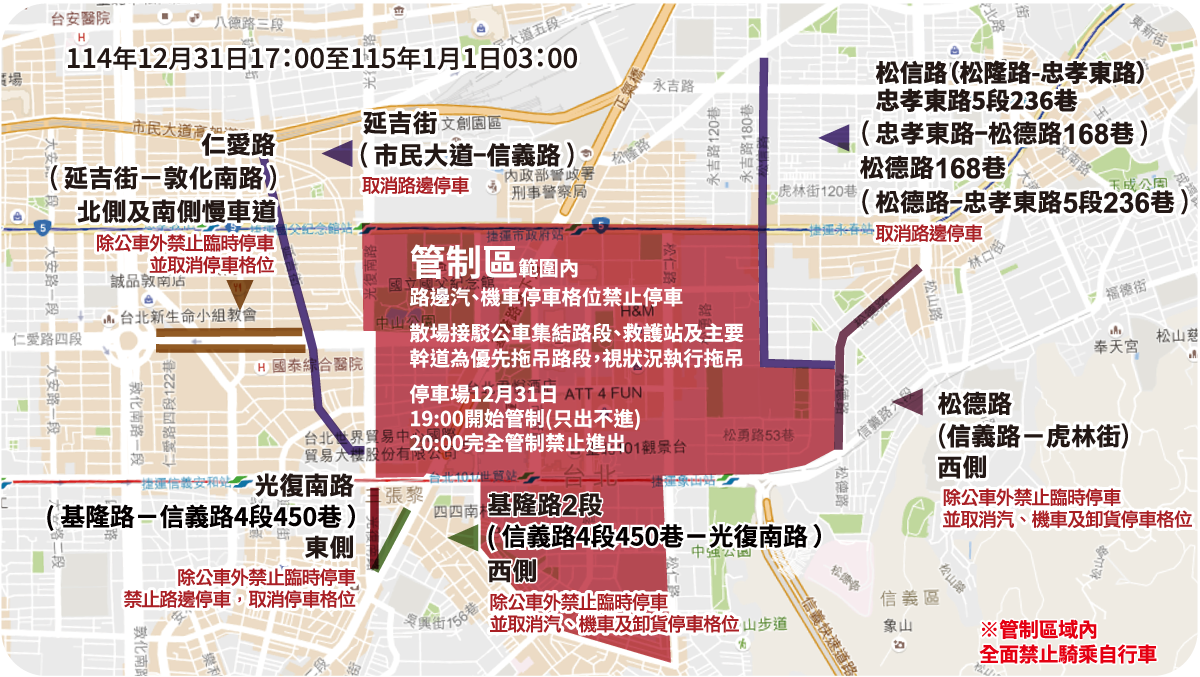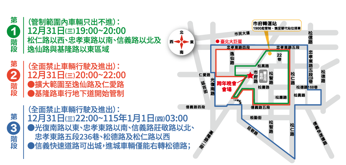 跨年晚會當天將分三階段進行交通管制,19:00-20:00 管制路段只出不進,20:00-03:00 禁止車輛進出。