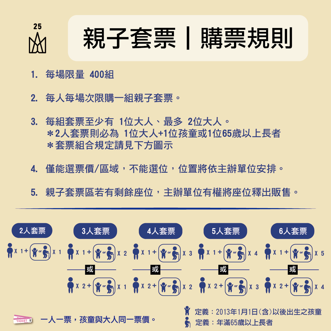 親子套票有兩人、三人、四人、五人、六人套票可選。以兩人套票為例,最多一位大人,並可搭配一位 2013/1/1(含)後出生的孩童或 65 歲以上長者 ; 三人以上套票最多兩位大人。