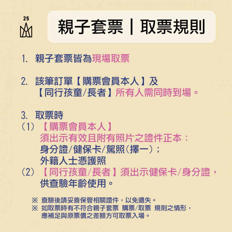 購買親子套票者,需在演唱會當天現場出示本人有照片證件正本(身分證、健保卡或駕照)、同行孩童或長者的證件驗證後,方可取票。