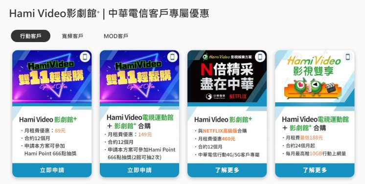 - Hami Video 影視館或電視運動館,每月優惠 89 元。