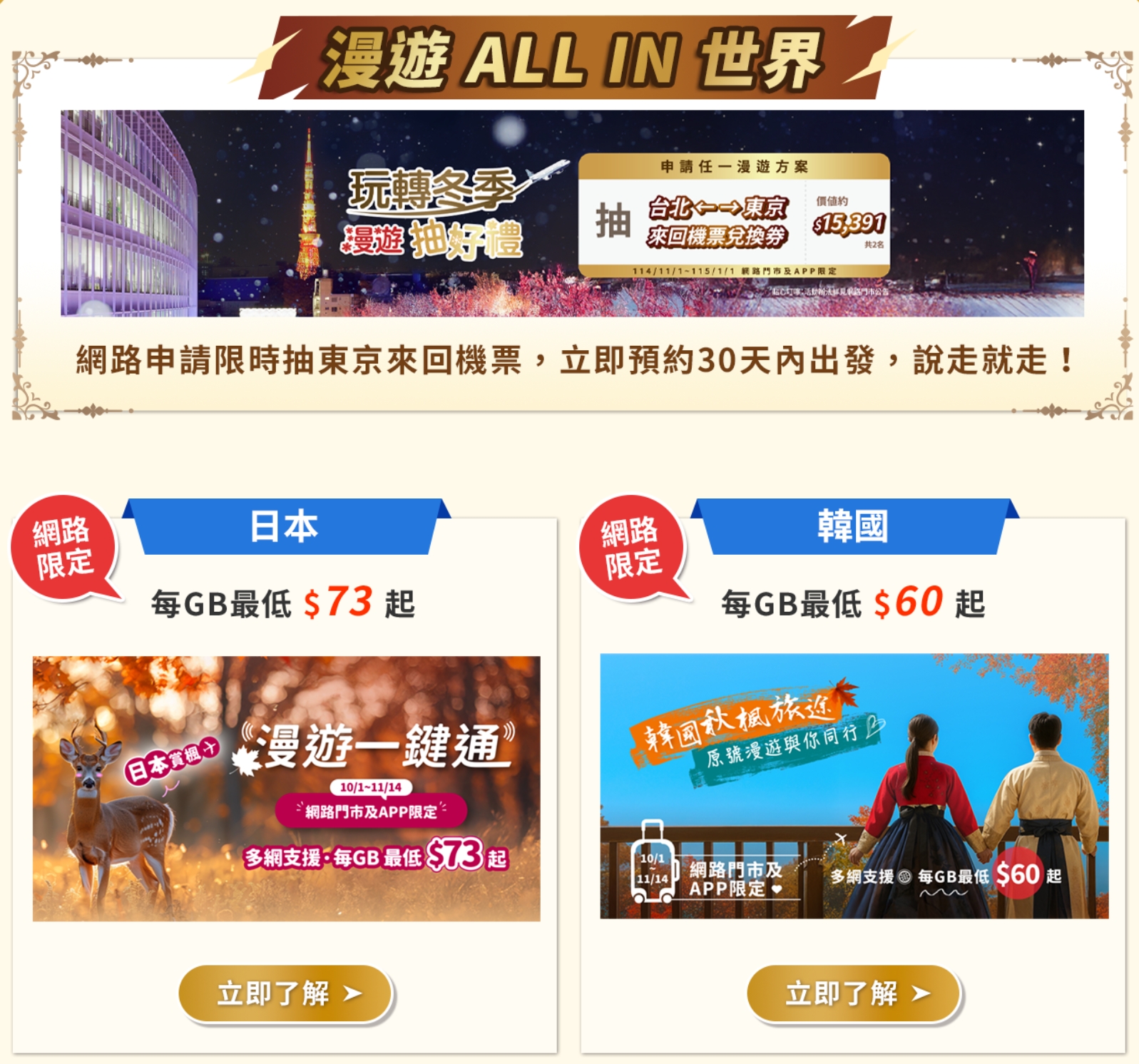 有打算出國的朋友,可至中華電信 APP 或網路門市購買國際漫遊優惠方案 ! 2025 年 11 月 1 日至 11 月 14 日,日本 15 天 15 GB 優惠 1088 元,南韓 15 天 15 GB 優惠 888 元,美國 30 天 30 GB 優惠 928 元,東南亞 15 天 2 GB 優惠 249 元;全球通用日租型一天,適用美國、南韓、加拿大、中國、香港等 127 個國家,優惠 298 元。11/1~1/1 申請漫遊上網方案,可參加抽長榮航空台北東京來回機票。