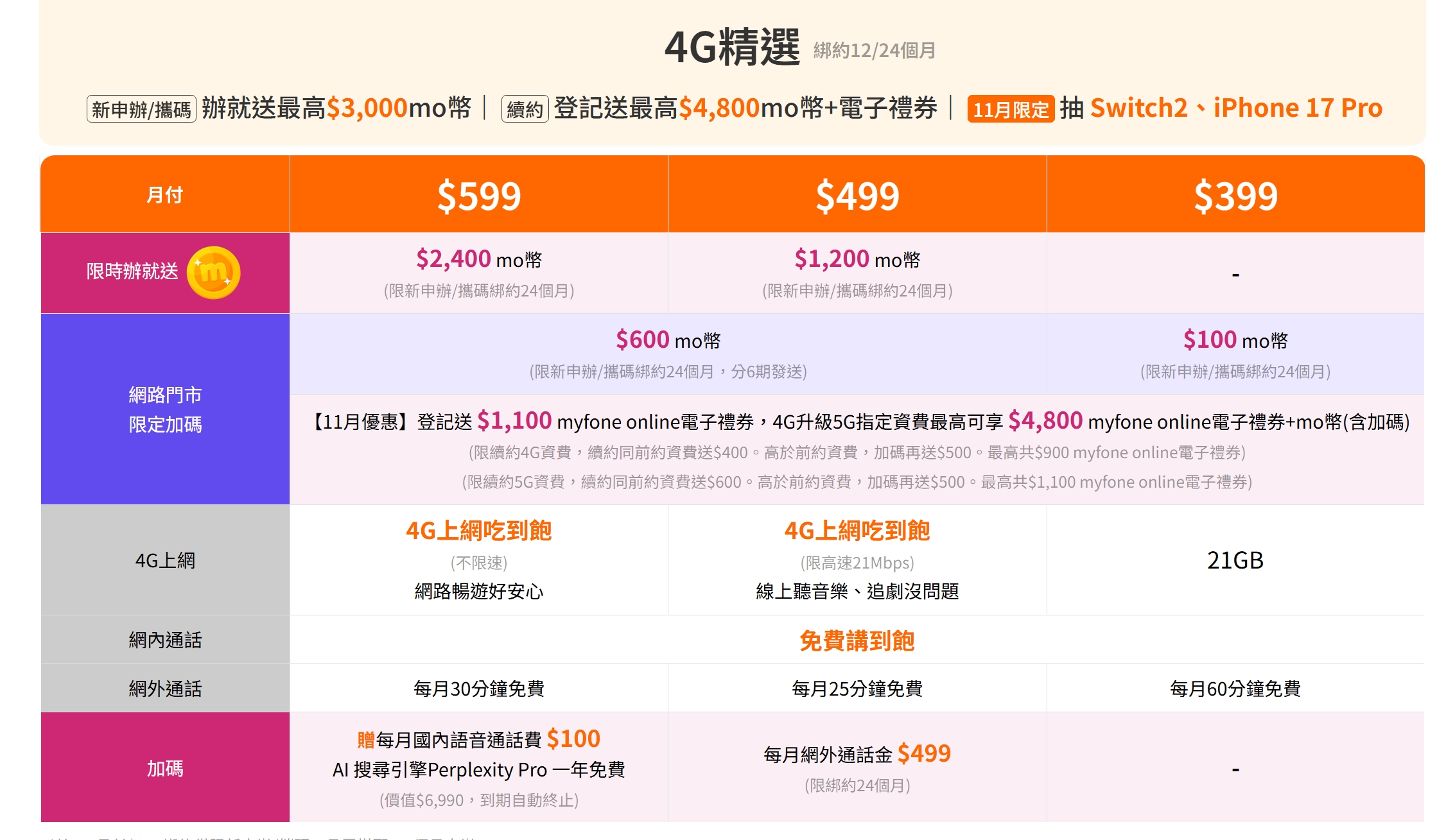 4G上網吃到飽優惠 599 元,含網內通話免費、網外免費 30 分鐘、每月 100 元國內語音通話免費、Perplexity Pro 一年免費,加送 2400 元+600 mo幣;499 元含網內免費、網外通話 30 分鐘免費、每月網外通話金 499 元。