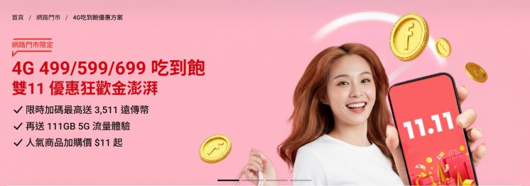 遠傳電信於 2025 年 11 月 1 日至 11 月 11 日推出雙11優惠活動,在網路門市新申辦或攜碼 4G 月付 499 元、599 元 24 個月以上,加送 1111 遠傳幣 !