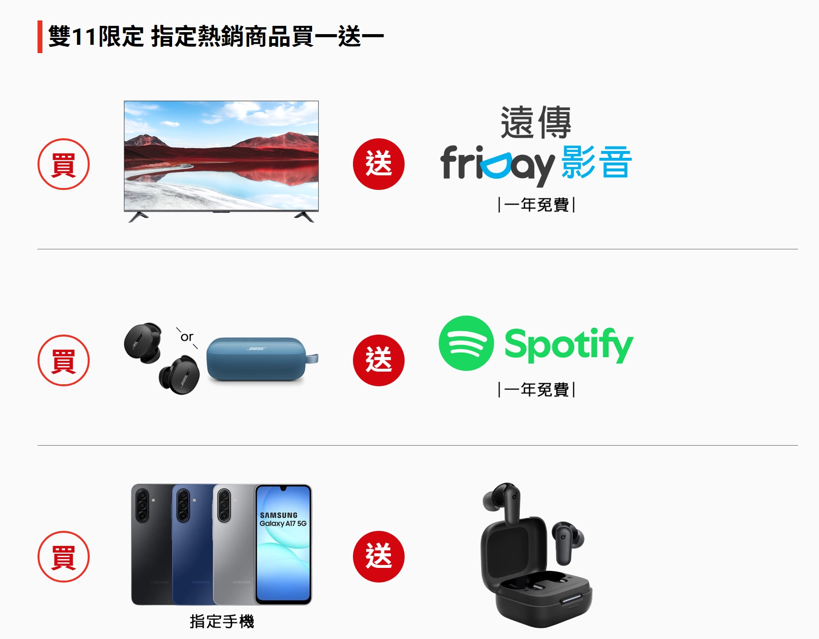 另外還有雙11限定買一送一,買電視送遠傳FriDay影音一年,買藍芽耳機送 Spotify 一年,買指定手機送耳機。