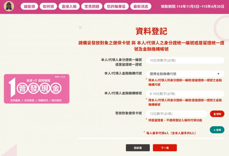 需特別留意,身份證字號與金融機構帳號必須為同一人,不能填自己的身分證但填另一半(伴侶)的銀行帳號,避免入帳失敗。如填寫錯誤,可於 11/13 後回到網站重新登記,或改用 ATM 或郵局臨櫃領取。