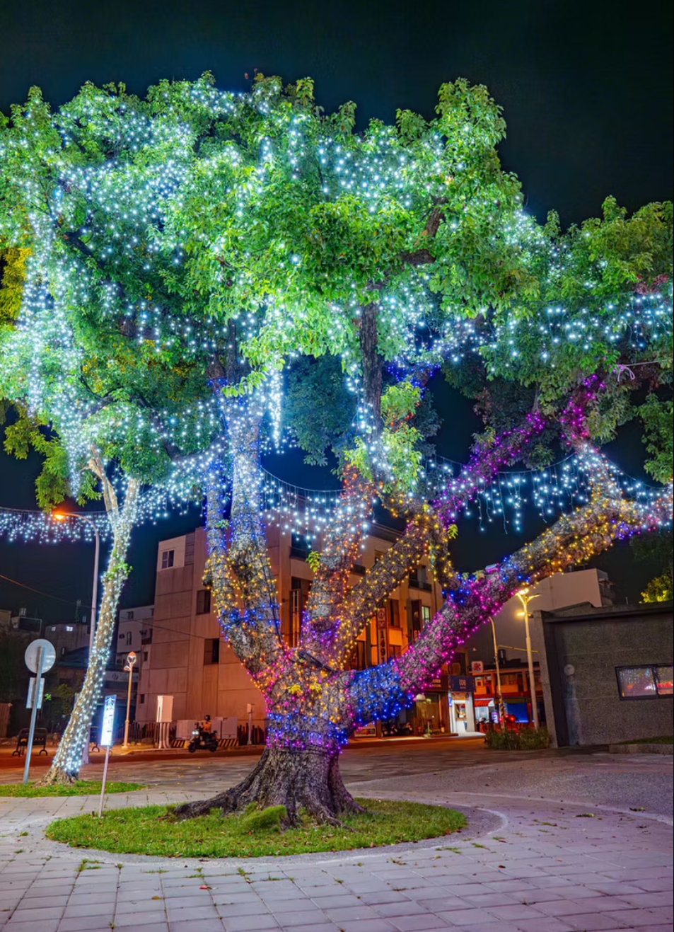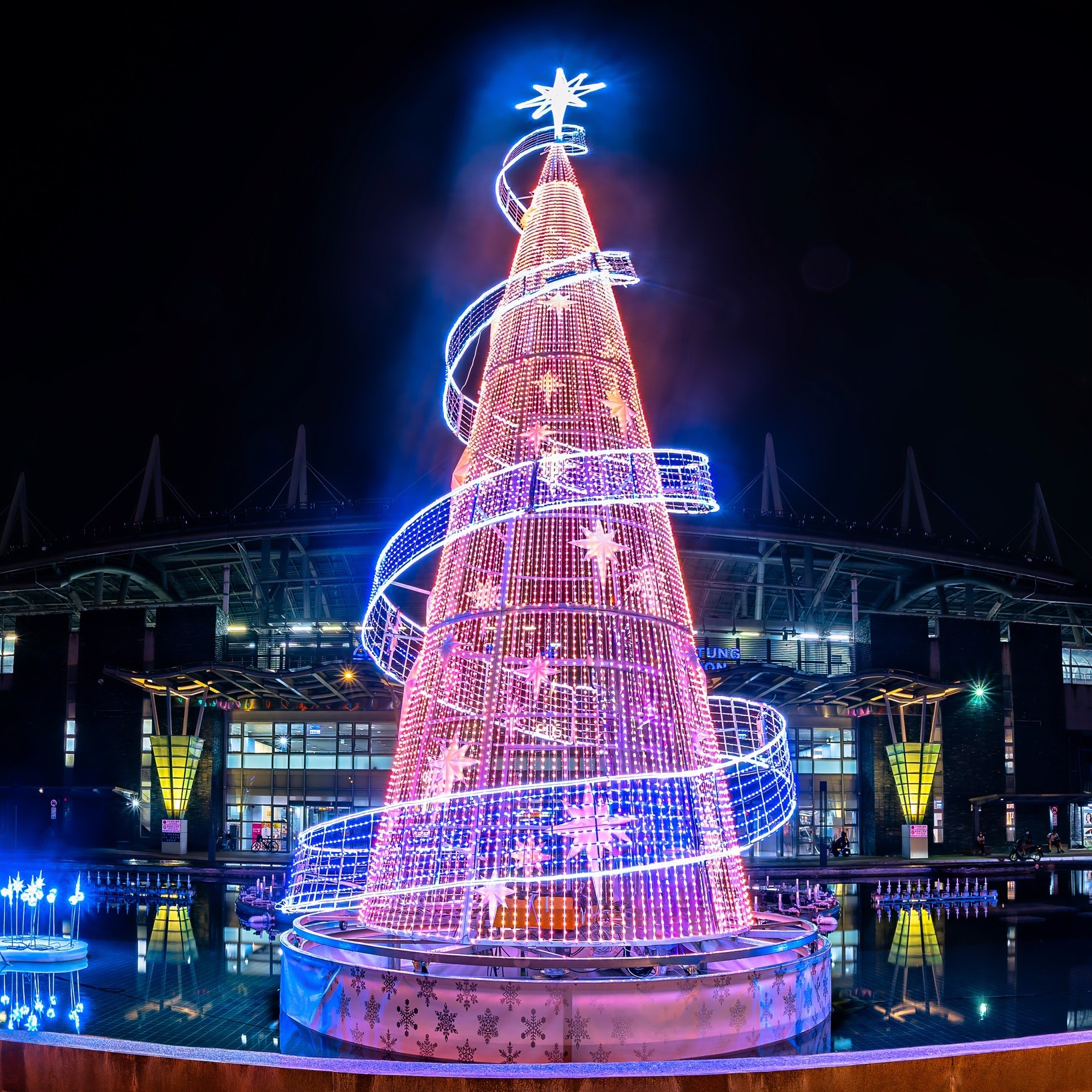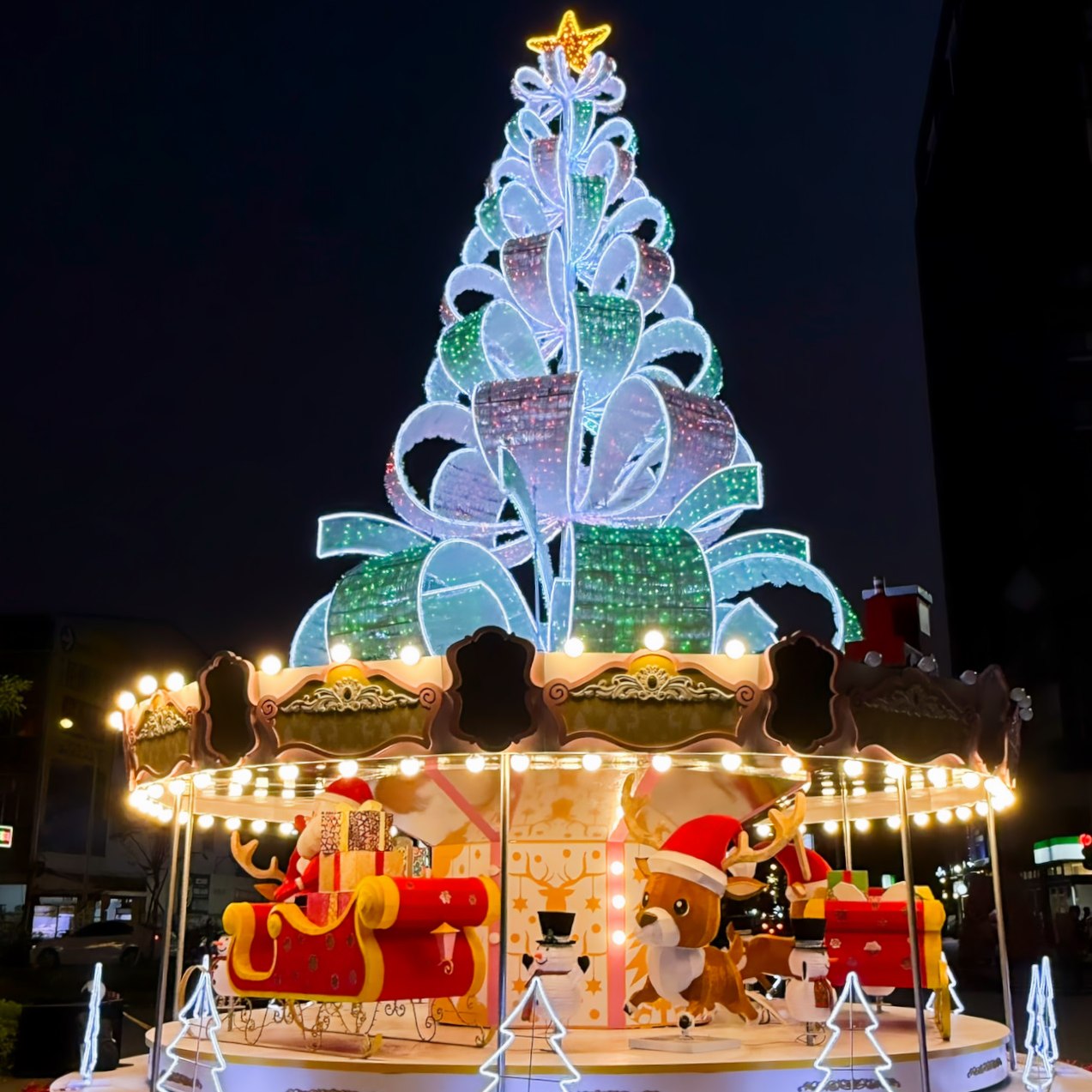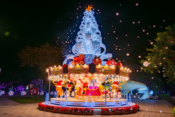 其中屏東公園的聖誕樹是一棵以緞帶為樹形的主燈,聖誕老公公、馴鹿坐在旋轉木馬上,散發著溫暖的光芒。特別是這棵聖誕樹每天晚上 6 點起有燈光秀,將結合星光、雪橇級列車打造絢麗燈景,不容錯過 !