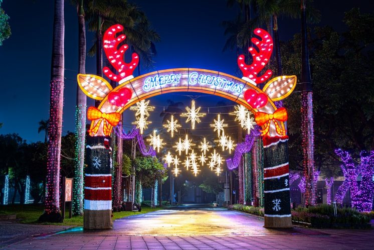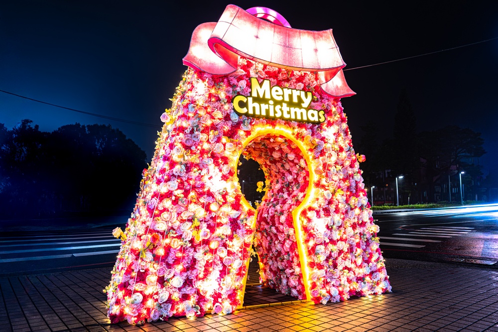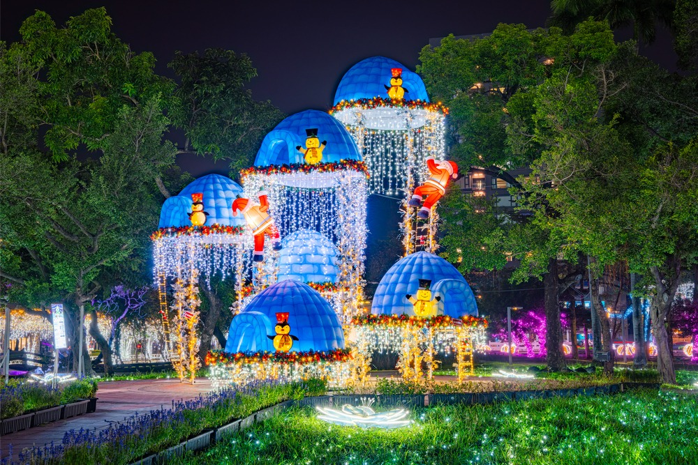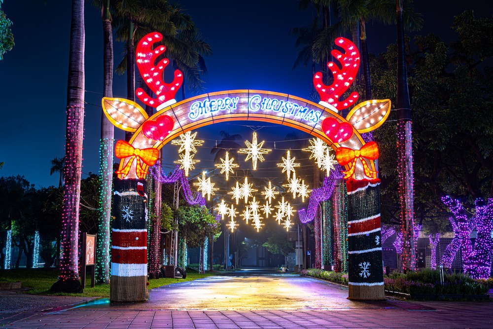迎接聖誕節,今年屏東公園與屏東火車站共有 19 座主題燈飾,其中主場地公園內有 13 座,火車站有 6 座,會在每晚 17:30-22:00 亮燈。