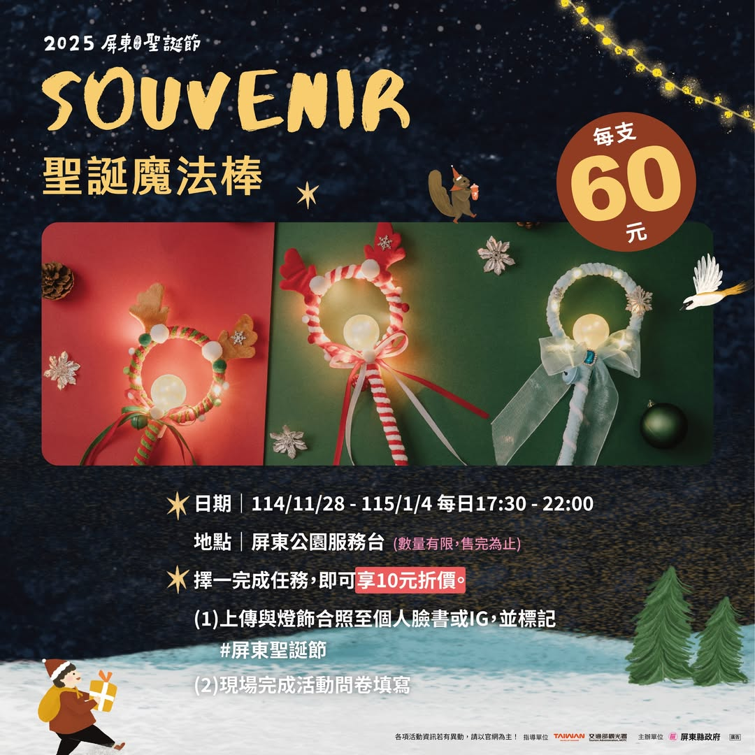 活動期間與燈飾合照並上傳至 FB 或 IG,標記屏東聖誕節,並於現場填寫問卷,可享「聖誕魔法棒」折價 10 元優惠,一個特價 50 元。