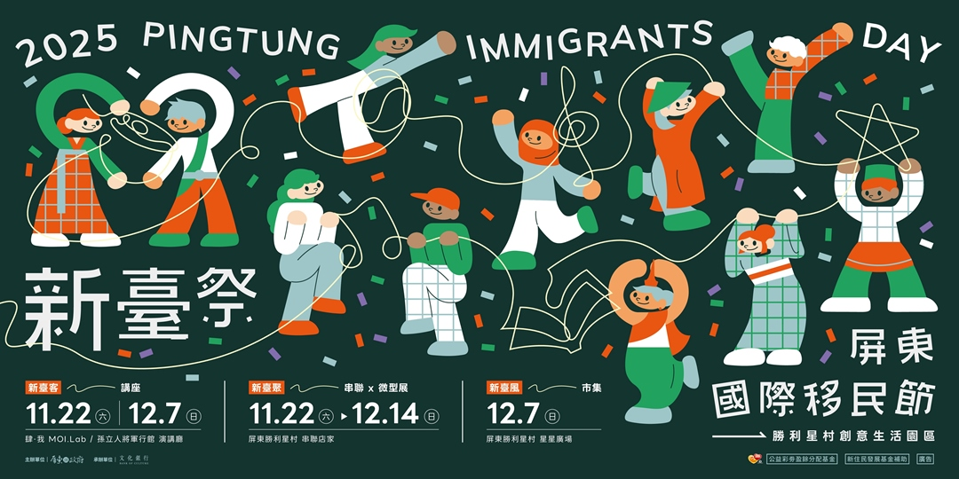 11/22(六)~12/14(日) 在勝利星村有「屏東移民節-新臺祭」,不僅現場有微型展覽介紹台灣的移民議題,還有 7 場音樂、飲食及藝術體驗,通通免費 ! 另外還有店家優惠、集章換好禮活動,適合趁著假期來參加。👉詳情資訊