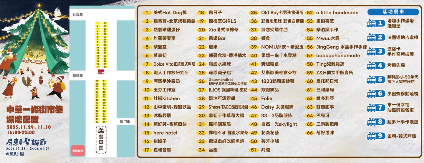 | 中華一條街市集 | 11/29~11/30 16:00-22:00 中華路(民生路至林森路段) |