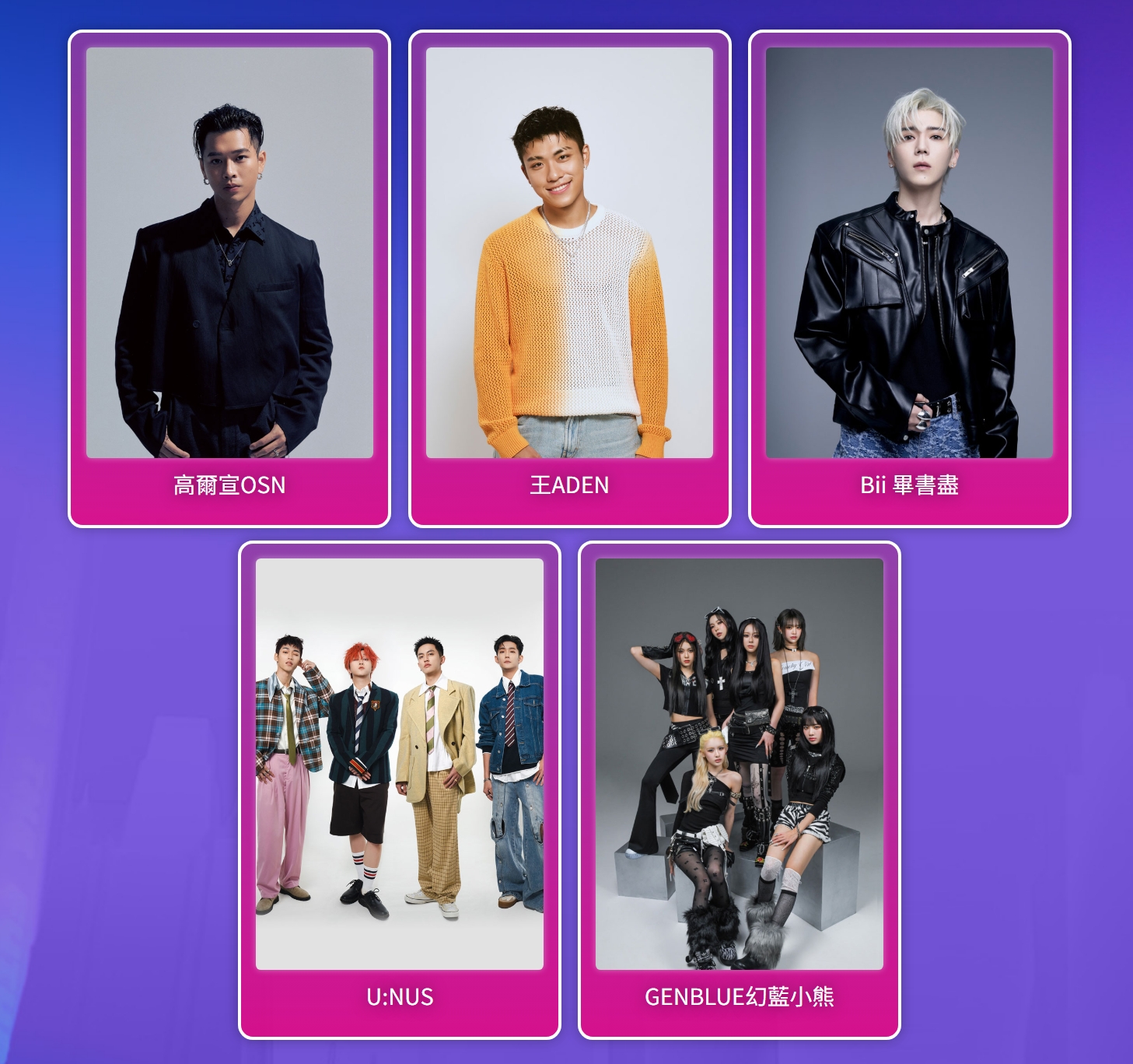今年表演者有高爾宣、王ADEN、畢書盡、U:NUS、GENBLUE幻藍小熊,包括超人氣男團、饒舌歌手、情歌王子、新生代女團都將來到現場,卡司陣容將持續公開。