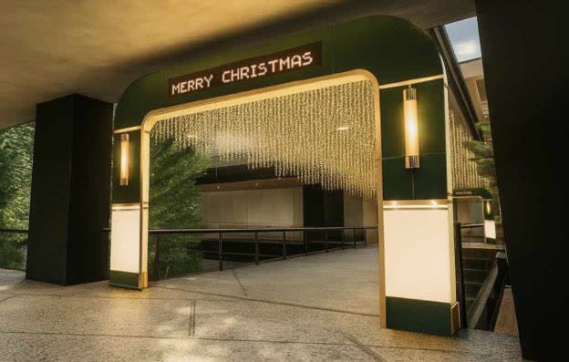 台南西門新天地目前一樓水幕前也有聖誕節打卡景點,可以看到掛著金銀彩球的聖誕樹、禮物盒,每週假日還有飄雪秀 !