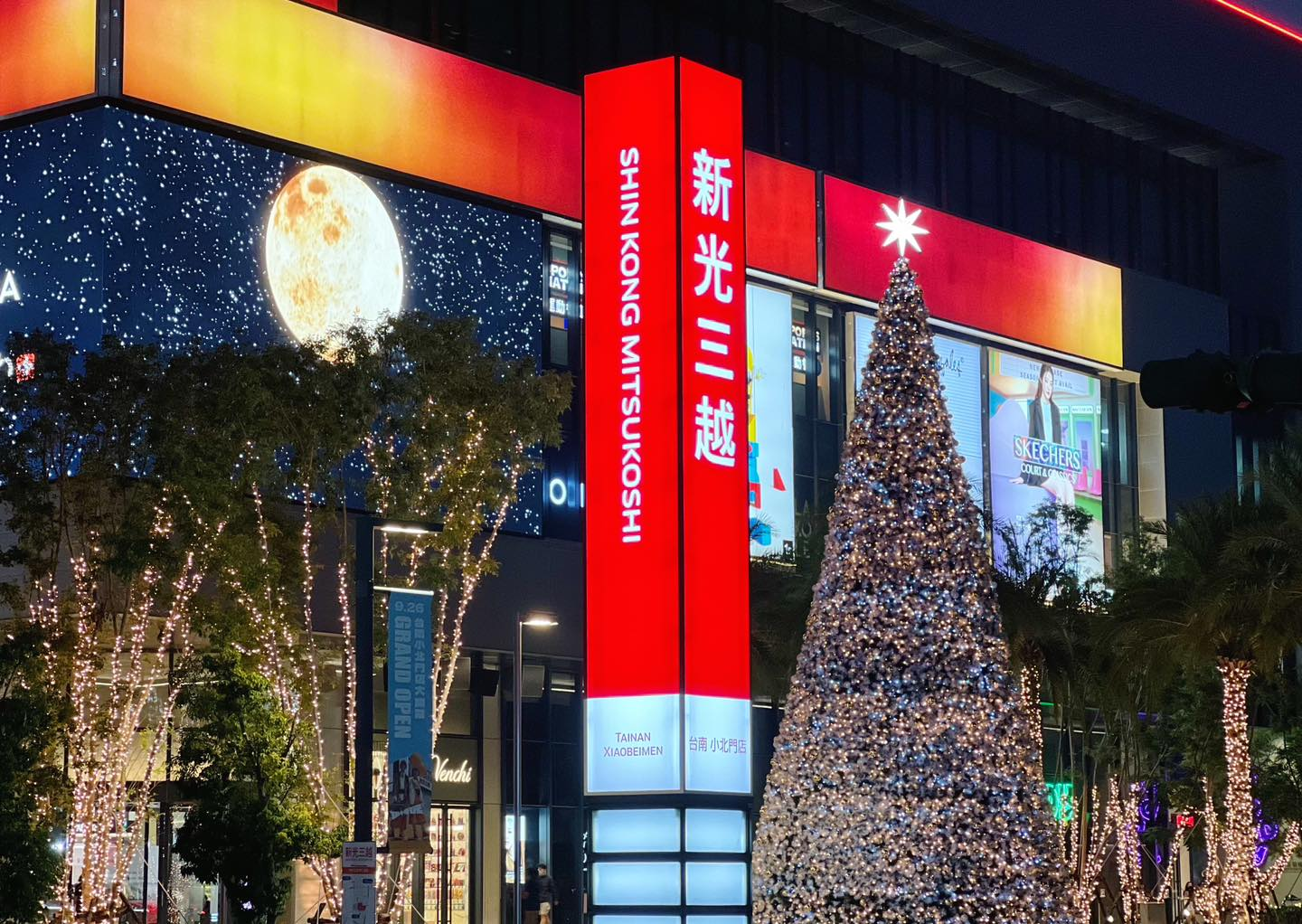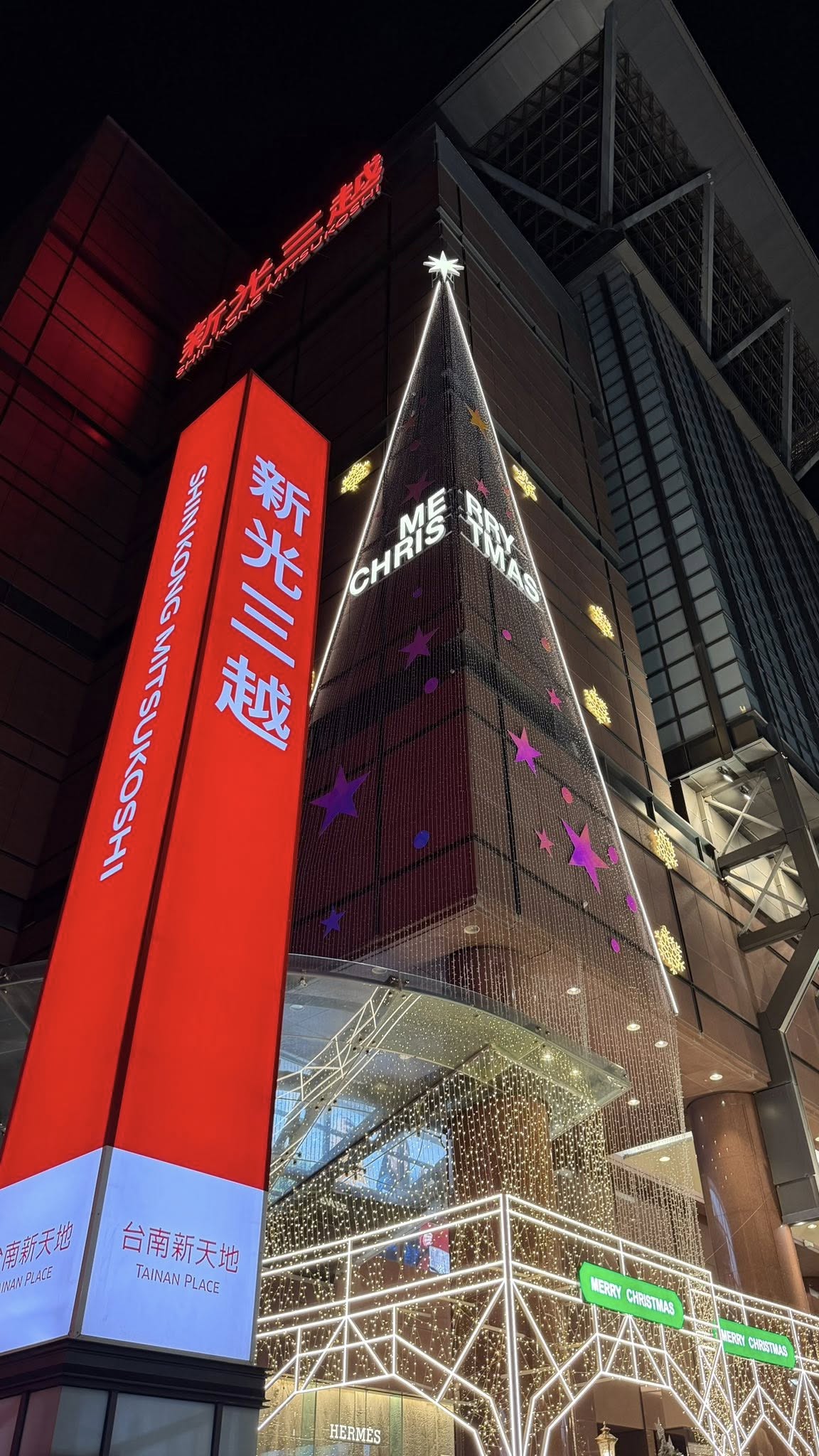 新光三越台南小北門店的聖誕樹也於 2025 年 11 月 8 日起點亮啦,現在到門口就能看到 !