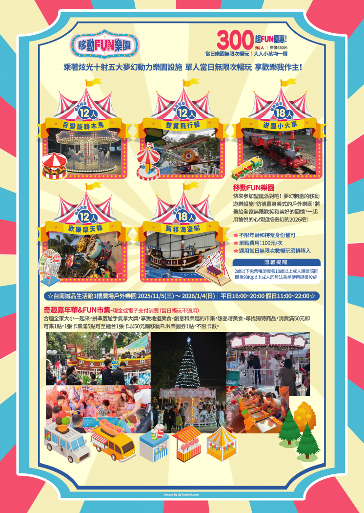 今年新開幕的「誠品生活台南」為慶祝聖誕節,於 2025 年 11 月 5 日至 2026 年 1 月 4 日推出「移動FUN樂園 奇妙歡樂耶誕埕」活動,打造歡樂聖誕嘉年華 ! 現場設有旋轉木馬、海盜船、摩天輪、小火車等遊樂設施,2 歲以下免費玩,現在大人、小孩一日門票優惠 300 元,可無限暢玩一整天 ! 👉前往購票