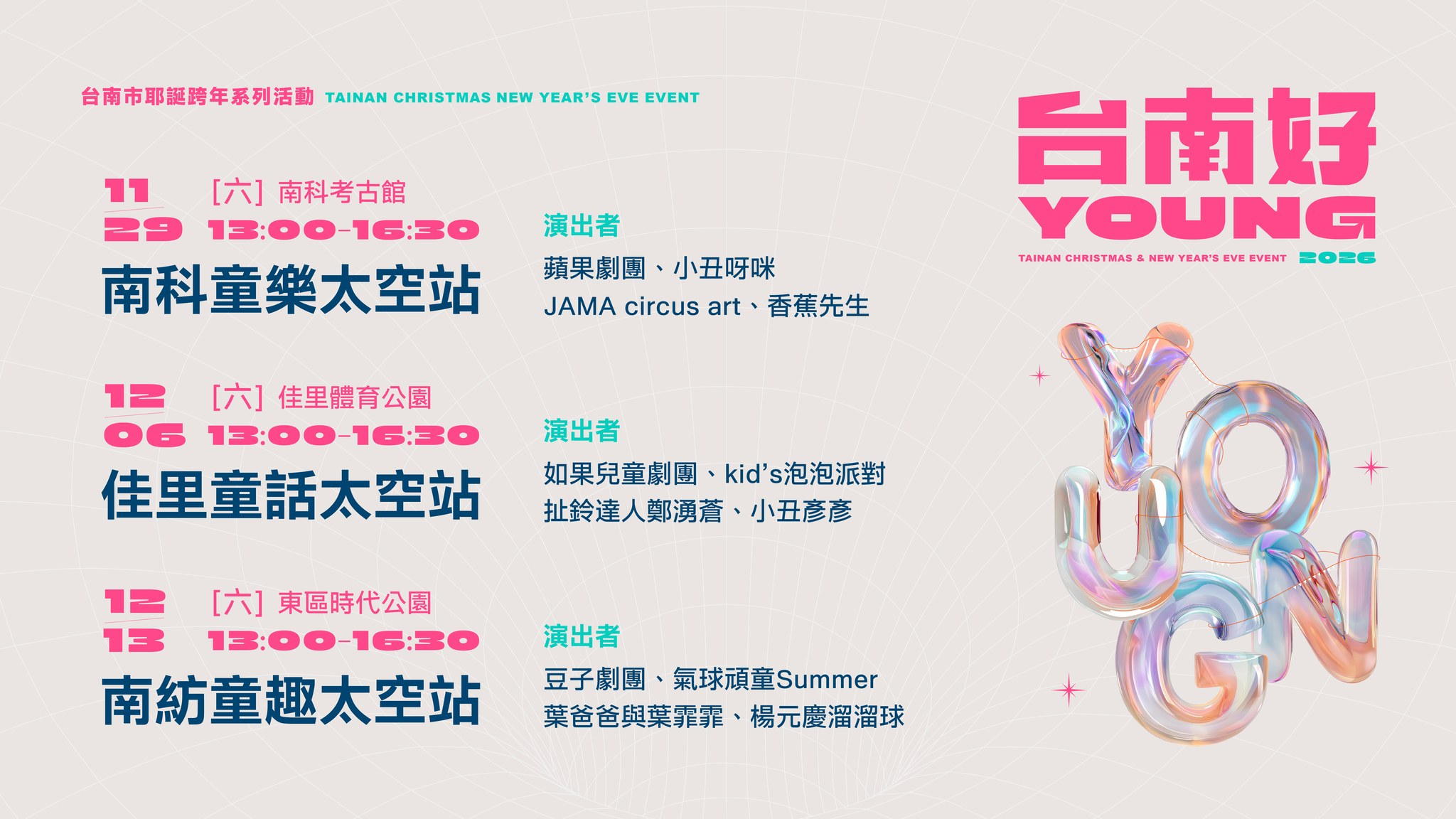 台南市政府舉辦的耶誕跨年系列活動將在 2025 年 11 月 29 日起登場,不只兒童劇團會到南科、佳里、東區時代公園演出,還有大家期待已久的搖滾耶誕演唱會、南瀛草地音樂會,將陪伴大家一路到年底 ! 卡司資訊將陸續公開。