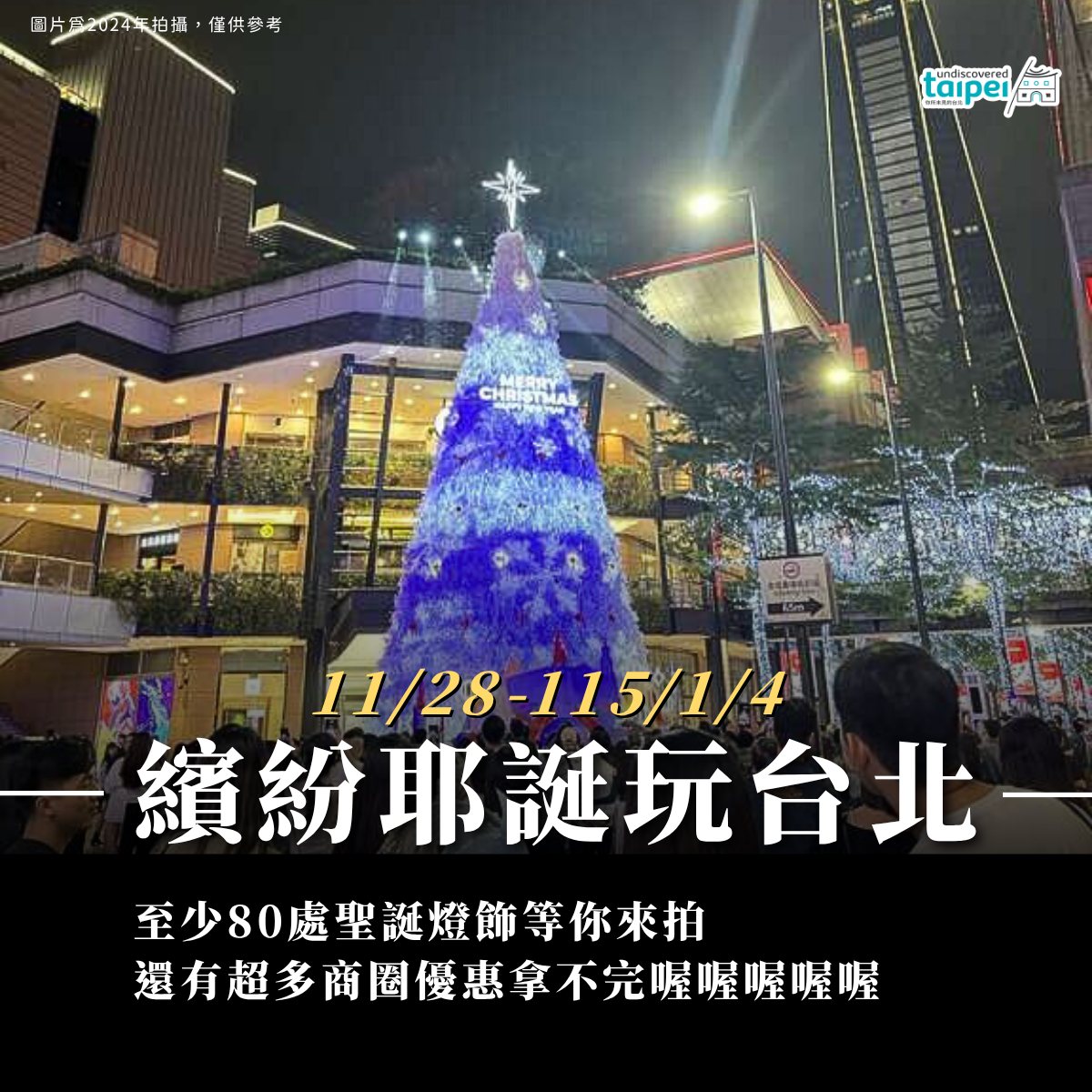 一年一度台北市聖誕節盛事「繽紛耶誕玩台北」在 2025 年 11 月 28 日至 2026 年 1 月 4 日登場 ! 今年主題是「光之覓境」,將在台北市設置超過 80 個聖誕燈飾,從信義商圈、西門町、忠孝敦化到大直都可以看到,不只大型耶誕造景、聖誕樹、聖誕裝置,還有集點活動,有機會獲得 10 萬百貨禮券。