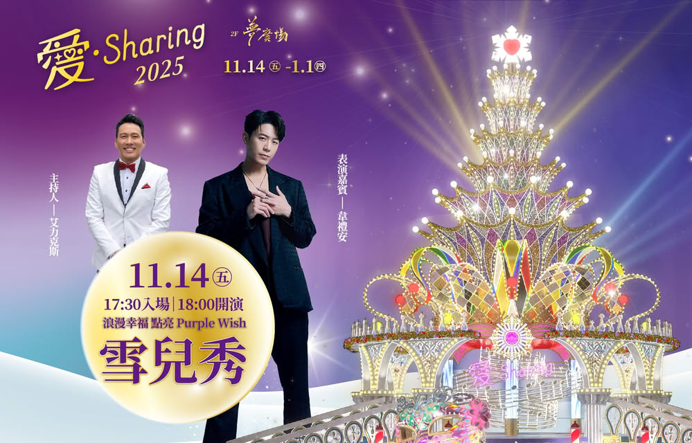 台北統一時代百貨的「愛Sharing」聖誕樹也亮相啦 ! 今年將在 2025 年 11 月 14 日舉行點燈活動,並會邀請歌手韋禮安來演唱,免費入場,快揪好友一起來聽歌。除此之外,現場還會飄白雪,可以來看雪花秀。