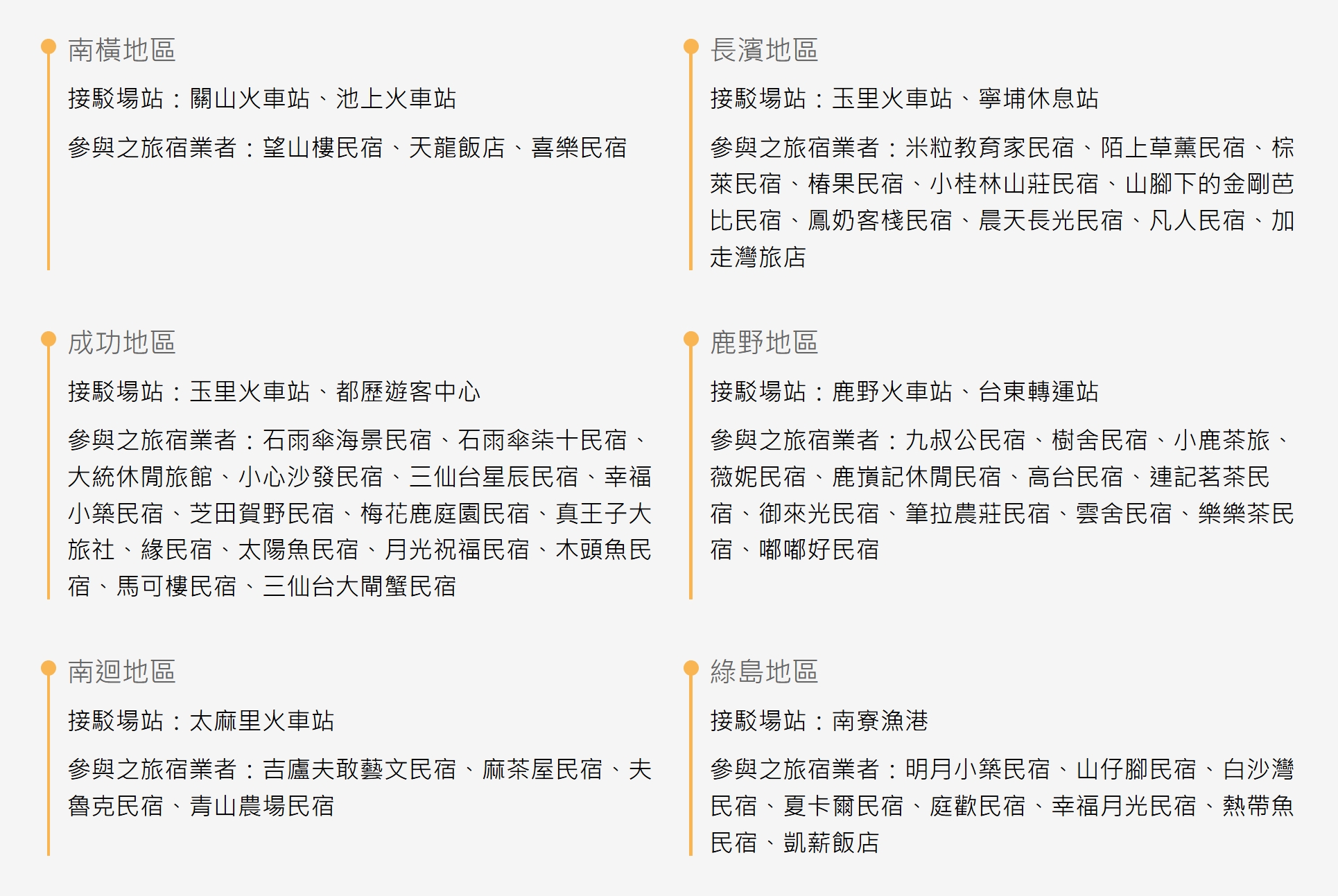 即日起至 2025 年 12 月 31 日入住台東合作旅宿,即可享有免費交通接駁,從住宿地點到鄰近火車站不用前 ! 適用台東南橫、成功、南迴、長濱、鹿野、綠島地區的飯店與民宿。