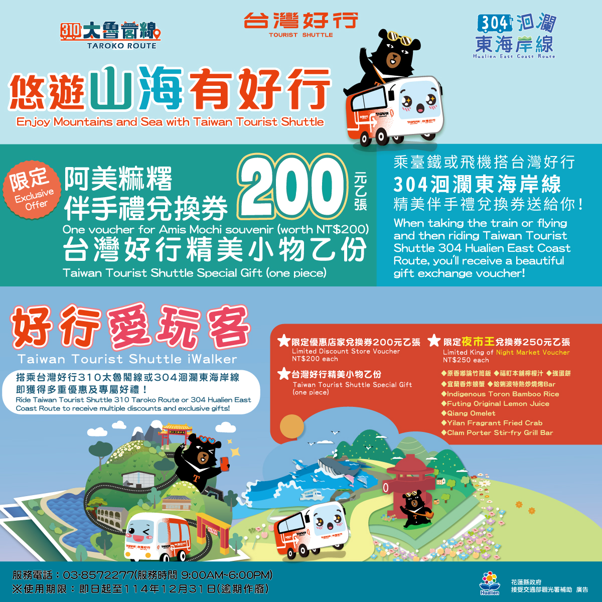 2025 年 10 月 31 日至 12 月 31 日台灣好行花蓮路線也有優惠 ! 現在搭乘台灣好行「310太魯閣線」、「304洄瀾東海岸線」,可憑車票兌換好康——花蓮夜市王兌換券 250 元、伴手禮兌換券 200 元、台灣好行精美小物(限量)。欲兌換好康需上網購買套票,優惠價 399 元(不含車票)。👉 詳情