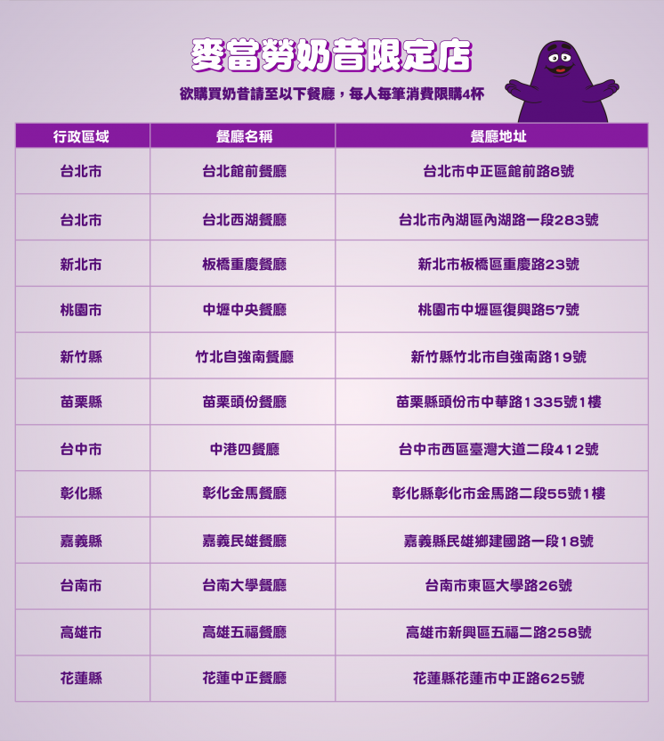 麥當勞奶昔可至以下 12 間餐廳櫃台購買,點以下連結可透過 Google 導航到各店。