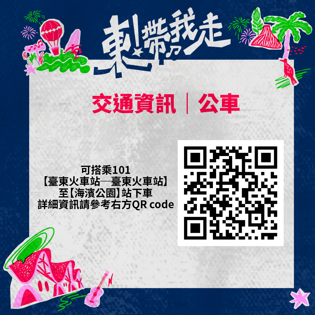 - 搭 101 公車、台東市區公車(普悠瑪客運)觀光循環線至「台東海濱公園」站下車 → 步行 10 分鐘抵達跨年會場。