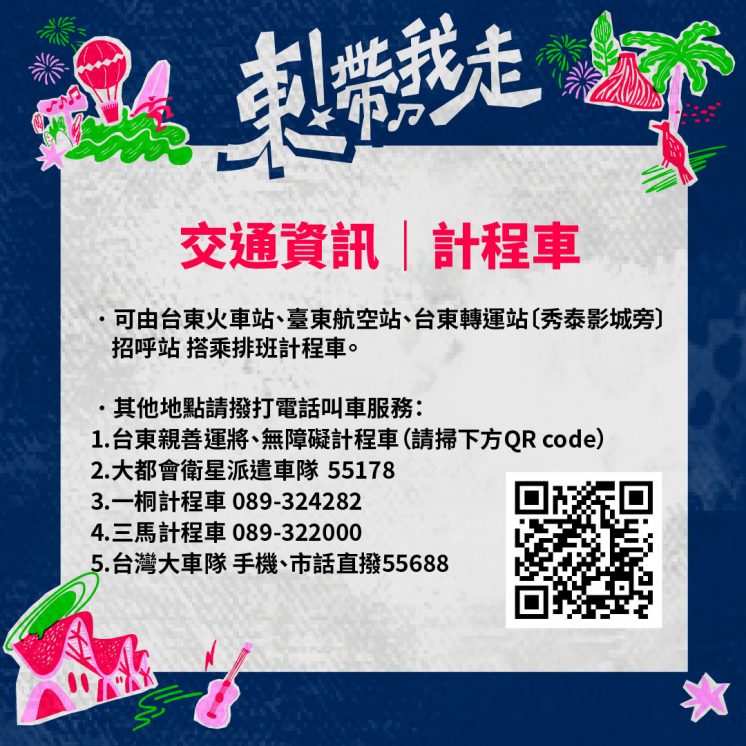 另外也可以在台東火車站、台督航空站、台東轉運站的招護站搭乘排班計程車,抵達晚會會場;可撥打以下電話叫車。