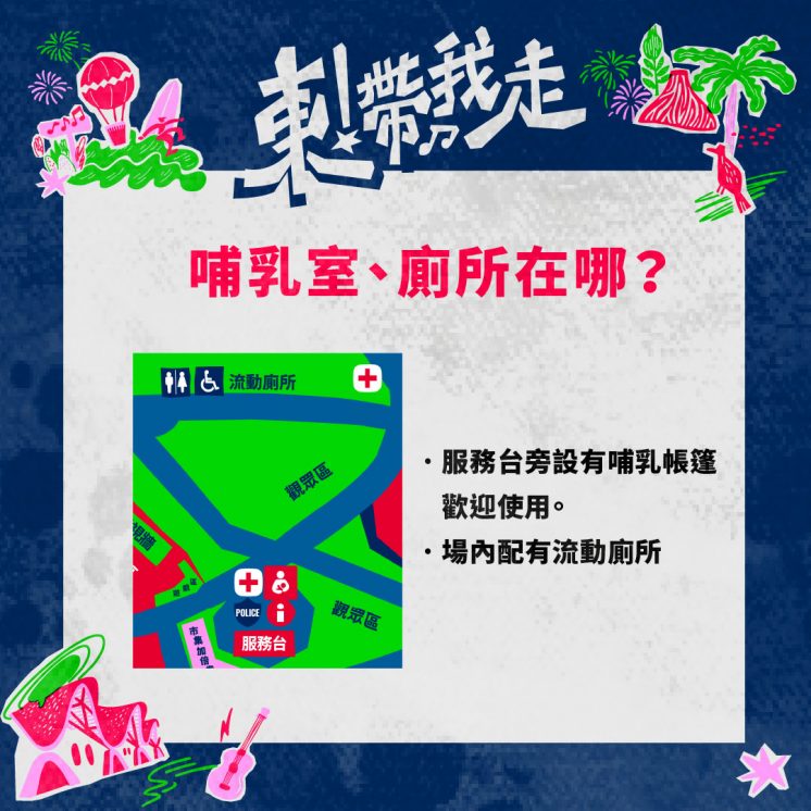 現場設有服務台旁邊設有哺乳室,觀眾區旁有流動廁所和醫護室,有需要的朋友可前往使用。
