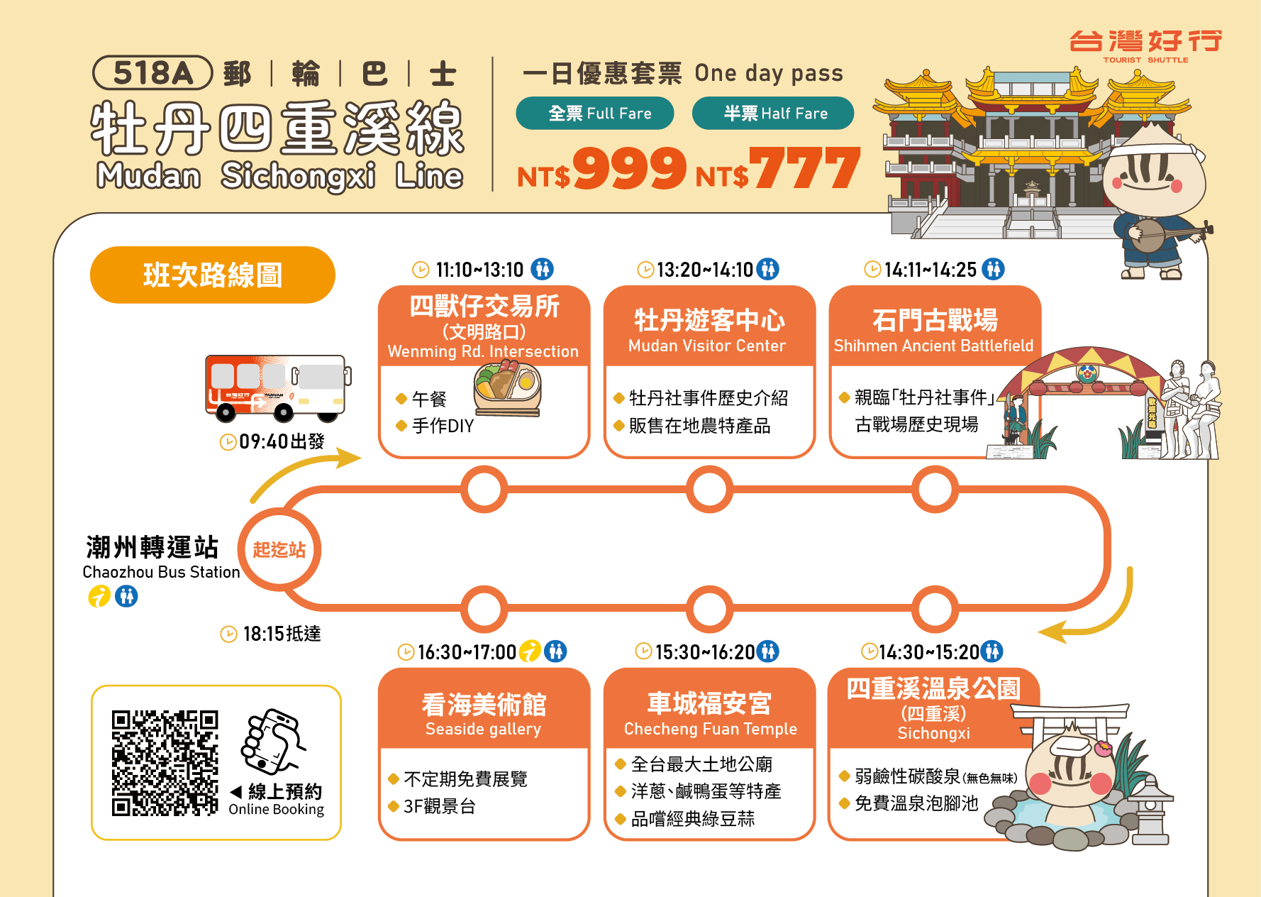 另外台灣好行推出「牡丹四重溪線518A」溫泉郵輪巴士,含定點接駁、餐食、手作DIY、專業導覽人員解說,一日套票全票 999 元,半票 777 元。👉活動詳情