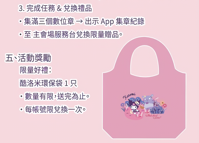 另有打卡集章活動,只要到楊梅休閒農業區合作的農場消費,並使用桃園市民 APP 掃描店家提供的 QR Code 即可集 1 個章,集滿 3 個章就可以至活動主會場服務台換「酷洛米環保袋」。