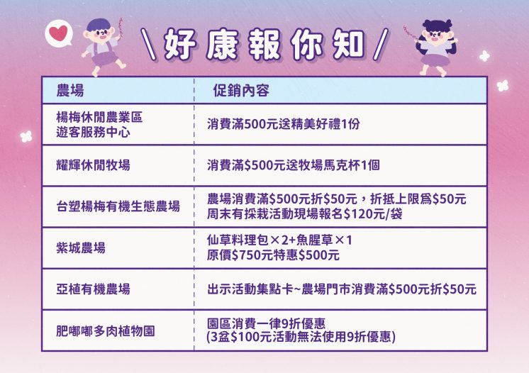另有集章尋寶趣活動,於仙草節期間至農場消費,集滿 3 個章可換好禮「蒲公英清潔組」,集滿 6 個章再加送觀光大使舒華小卡,200 份送完為止。