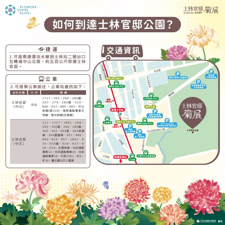 - 搭 111、1717、206、255、255區間車、260、260區間車、304承德、304重慶、557、620、683、957、680、小15、小15區間車、小16、小18、小18區間車、小17、小19、內科通勤專車13、內科通勤專車15、紅5、紅30、台北觀光巴士藍線公車至「士林官邸(中正)站」下車 → 步行 7 分鐘 → 抵達菊花展。