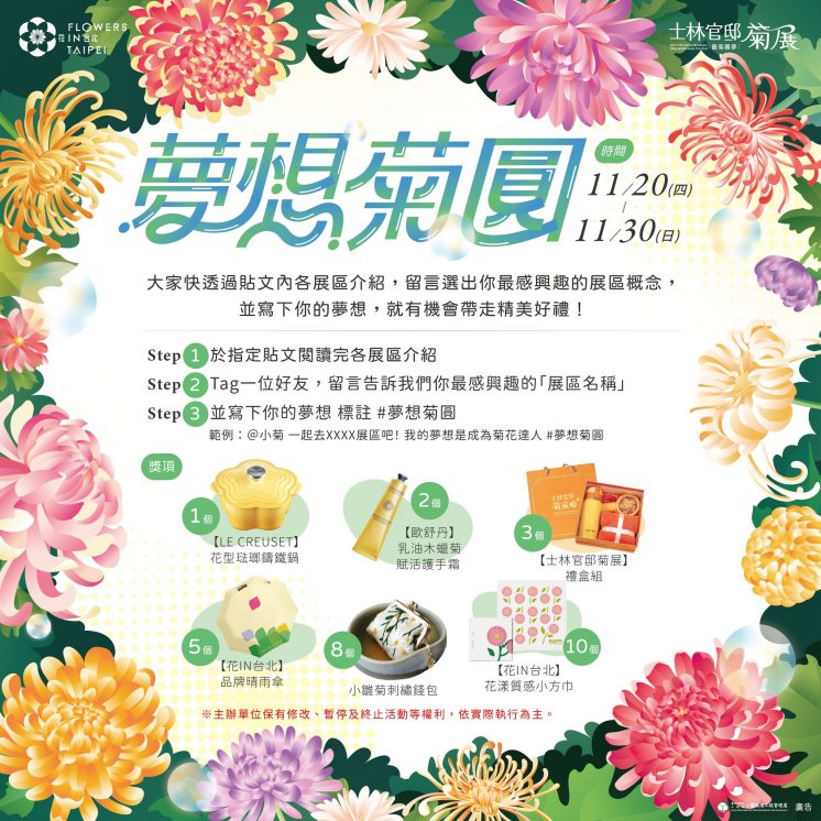 | 抽獎活動 至活動貼文看完介紹並留言即可參加 獎項: LE CREUSET-花型琺瑯鑄鐵鍋 歐舒丹乳油木蠟菊賦活護手霜 小雛菊刺繡錢包 花IN台北-晴雨傘 菊花小方巾 | 11/20(四)~11/30(日) 士林官邸FB |