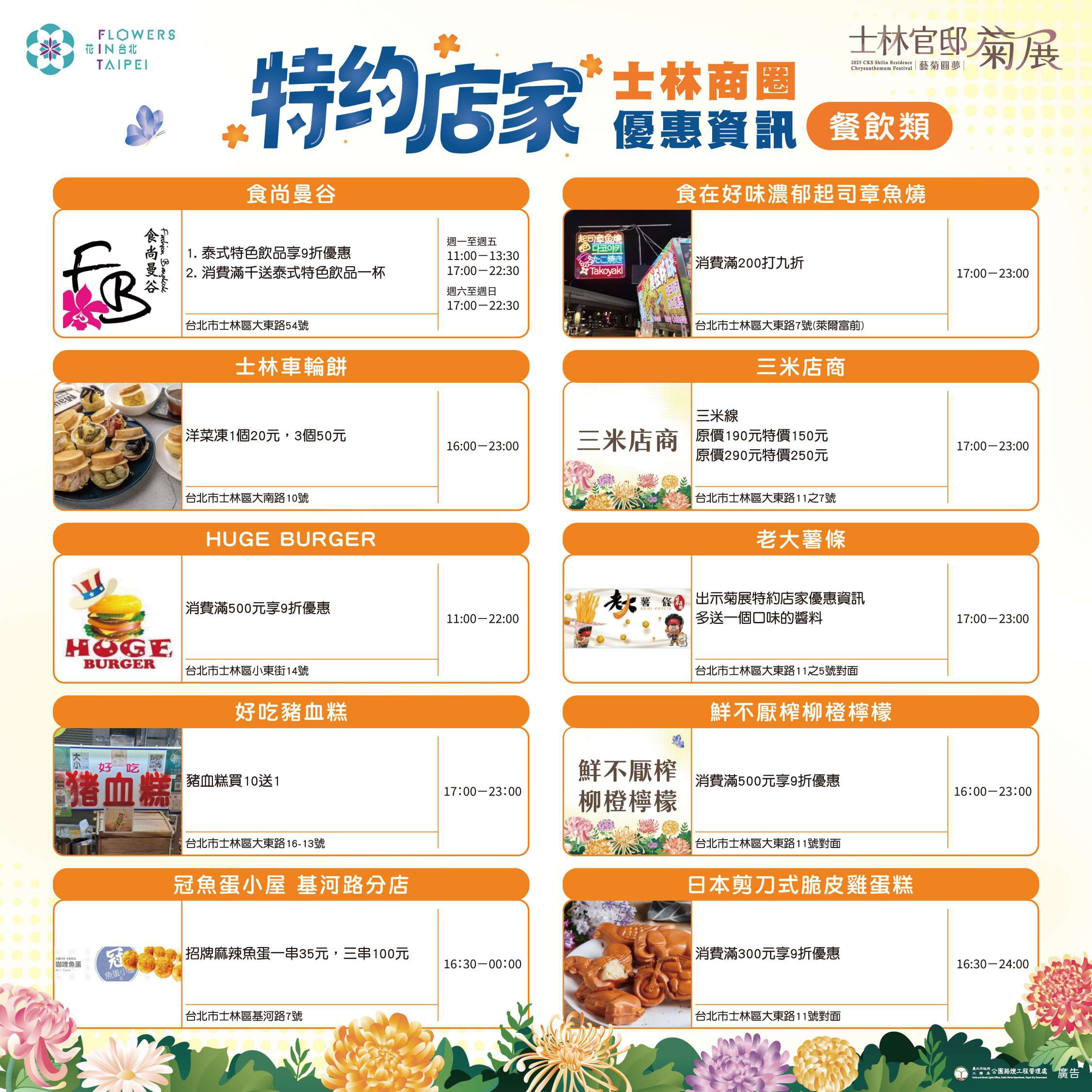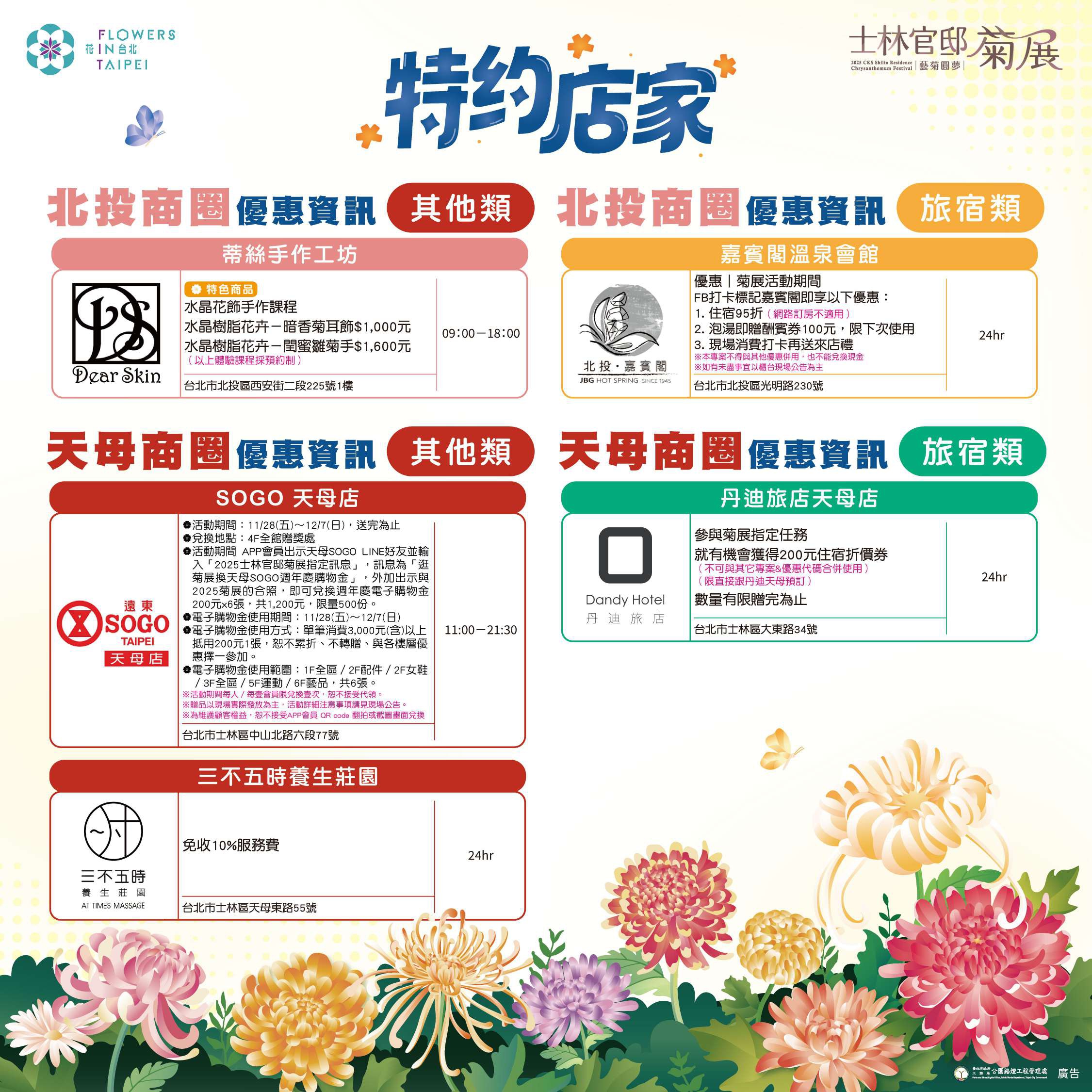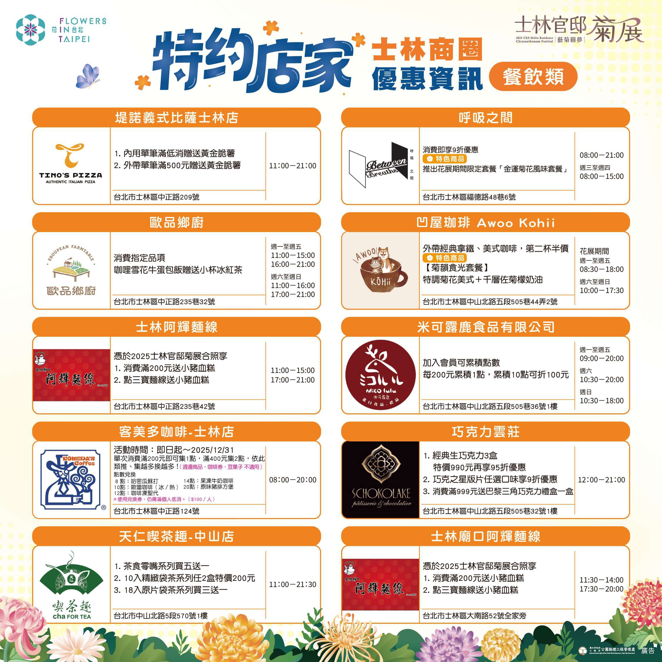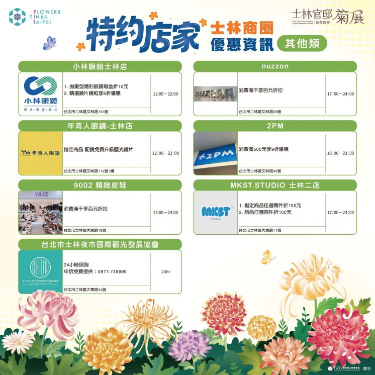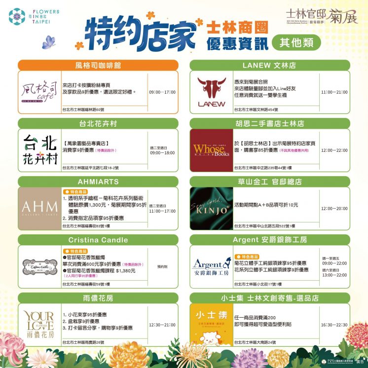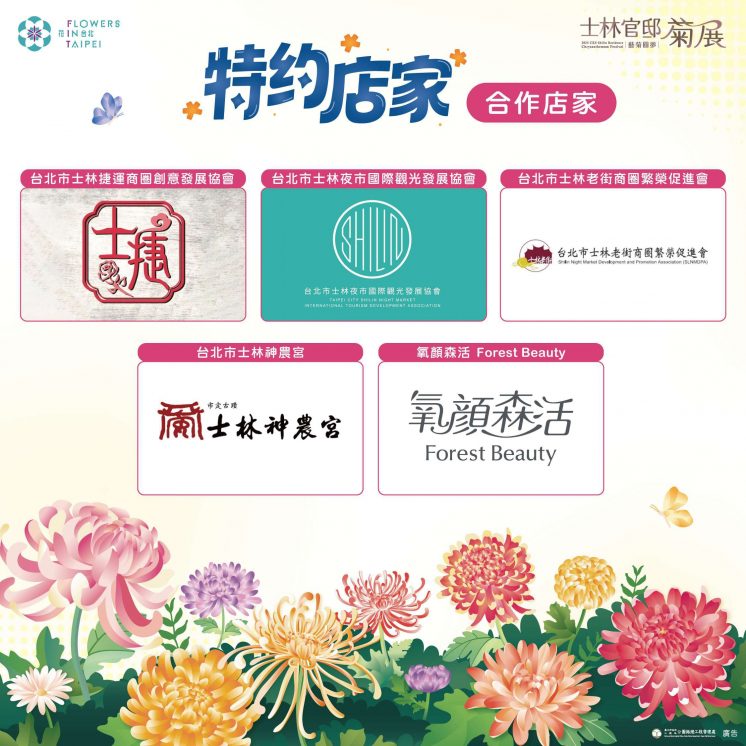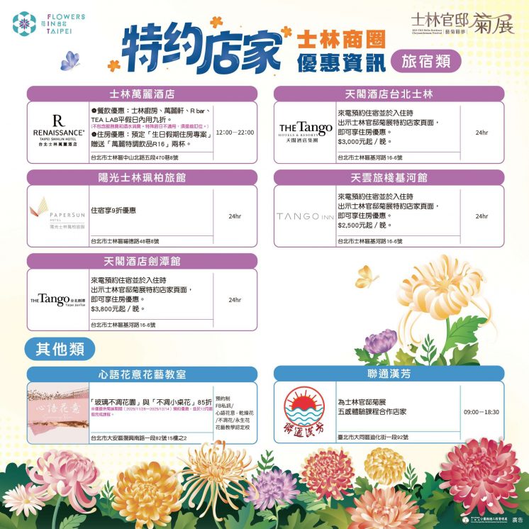 | 我的愛店 1. 至特約店家出示活動頁面,即可享有專屬優惠 2. 至活動貼文留言最喜歡的特約店家,可獲得精美禮物 | 12/1(一)~12/8(一) 菊展特約店家 士林官邸旅客FB |