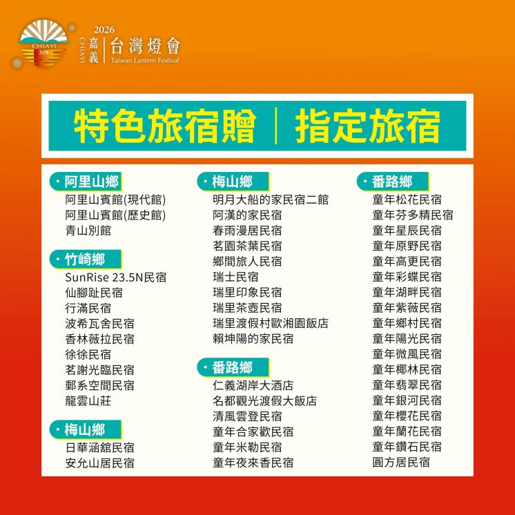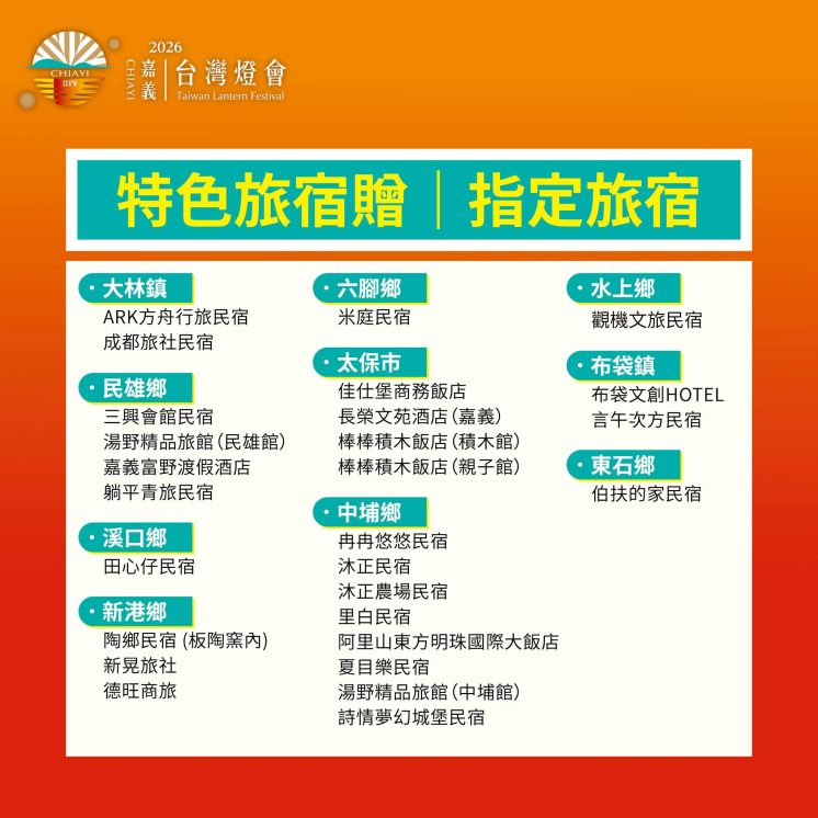 - 領取方法三:2026/3/2~3/4 在嘉義縣指定旅宿,憑住宿證明可於 3/3~3/15 燈會現場兌換 1 個。