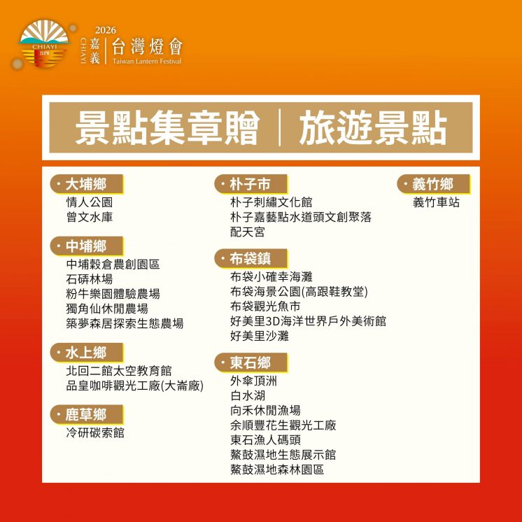 - 領取方法二:到指定景點打卡集滿 5 個章,可於 3/3~3/15 於台灣燈會現場領取(每日1,800份)。