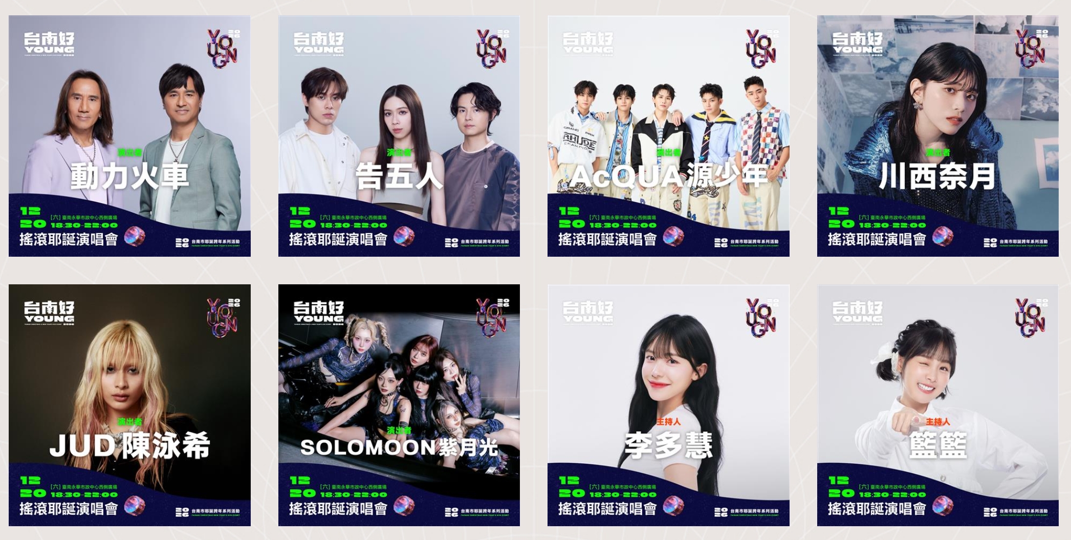 台南市搖滾耶誕演唱會將在 12 月 20 日登場,卡司有動力火車、告五人、AcQUA源少年、陳泳希、紫月光、(JP)川西奈月,並由李多慧、籃籃擔綱主持人。