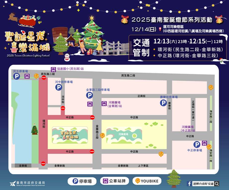 12/13(六)23:00~12/15(一)配合聖誕燈節系列活動,環河路、中正路將實施交通管制,車輛禁止通行。欲參加的朋友,可參考以下公車、YouBike 站點及停車場。