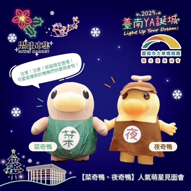 今年大東橋商圈攜手台南市立圖書館,將在 12 月 6 日至 7 日舉辦「臺南YA誕城」,活動兩天除了聖誕點燈、音樂表演,還有質感文創、銀色農創、好書兒童市集,並有小小消防員體驗、我愛毛小孩、吉祥物見面會活動,可以一起來玩。