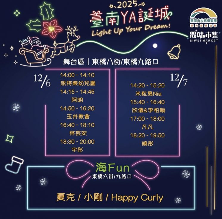 - 時間:2025/12/6(六)14:00-19:30 甜蜜市集、17:30-19:30 聖誕點燈晚會
