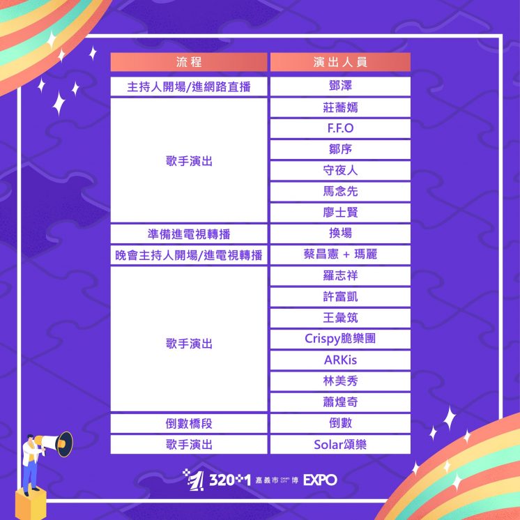 晚會當天將由主持人開場,緊接著由莊蕎嫣、F.F.O、鄒序、守夜人、馬念先、廖士賢、羅志祥、許富凱、王彙筑、Crispy脆樂團、ARKis、林美秀依序帶來演出,並由蕭煌奇擔綱倒數前壓軸卡司,頌樂為跨後最後一位歌手。