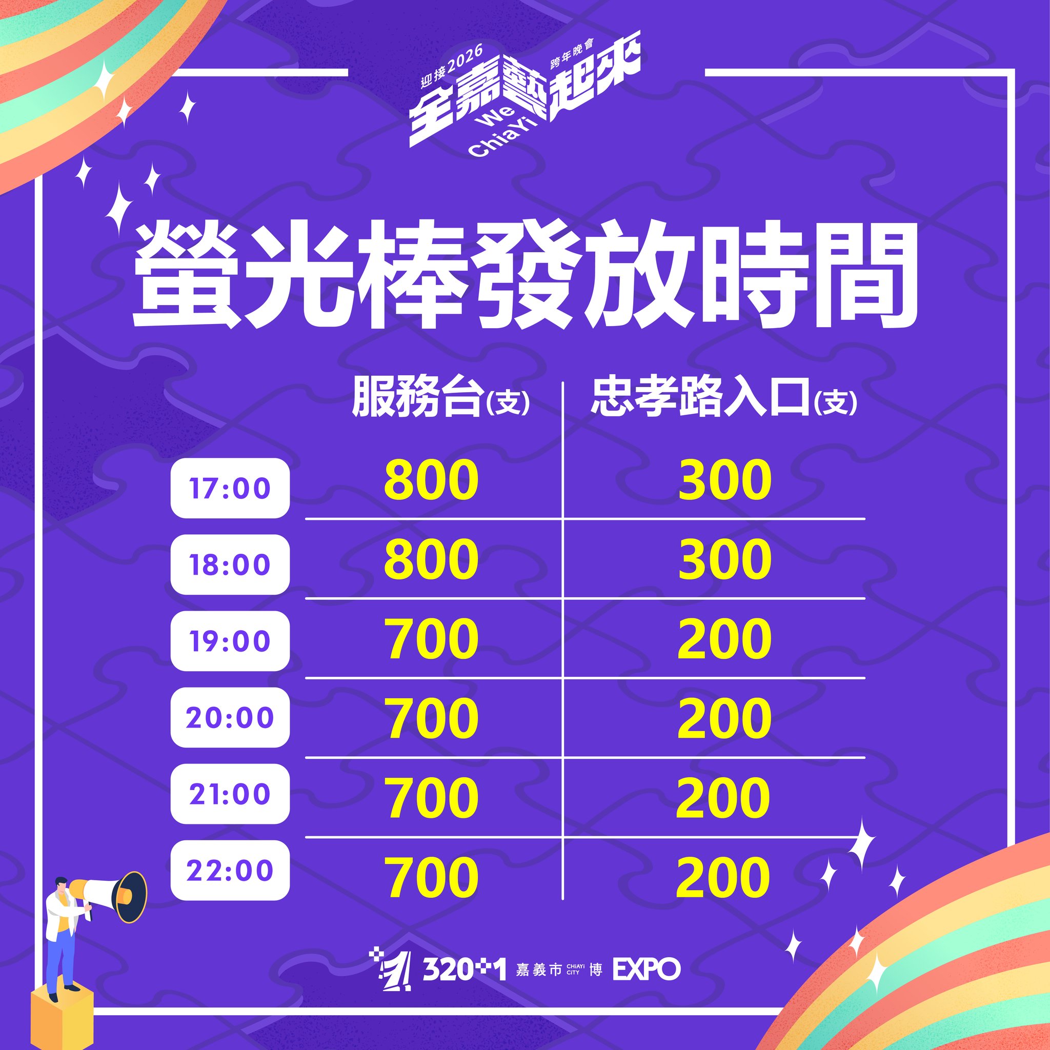 12/31 17:00 起將發放螢光棒,可至服務台和忠孝路入口領取。
