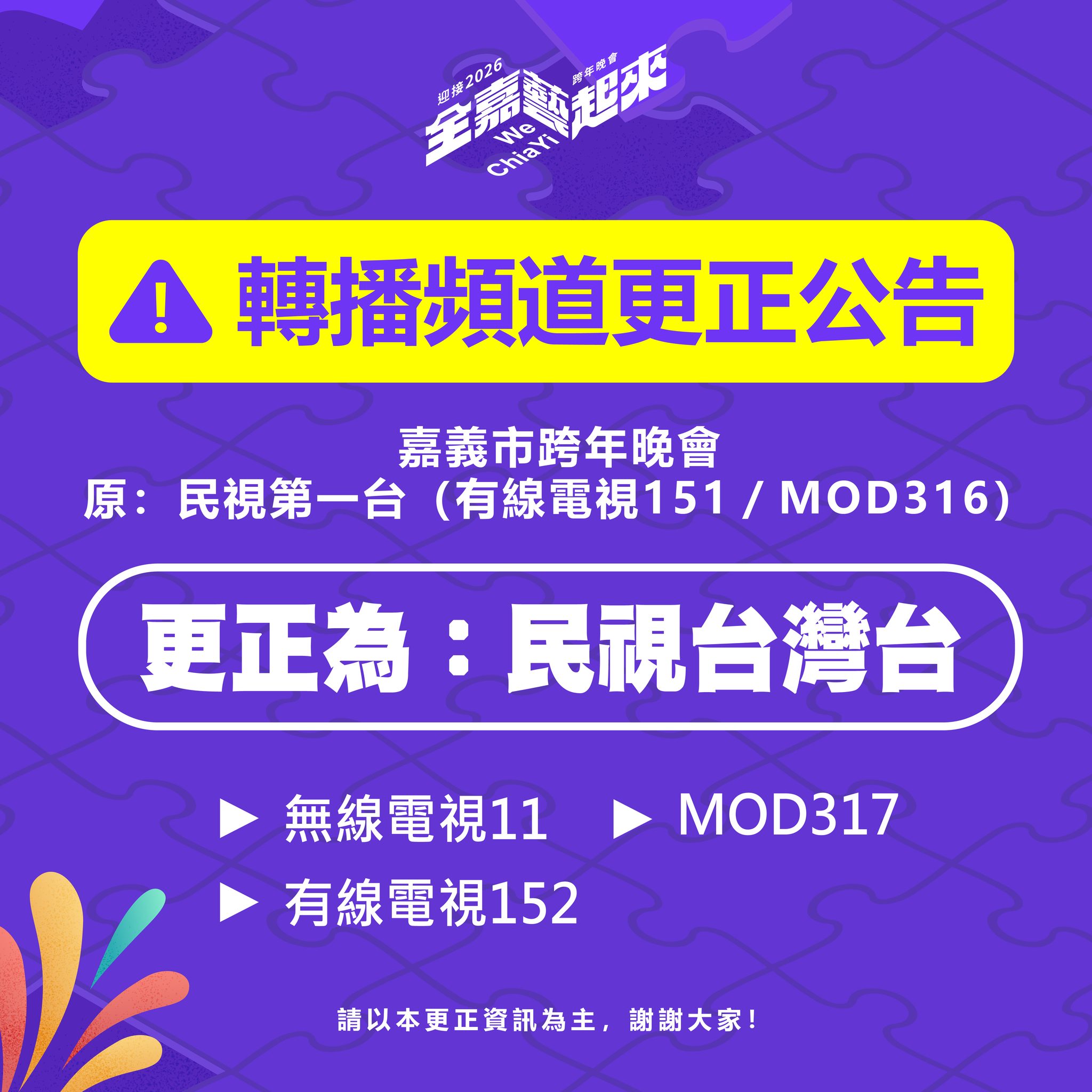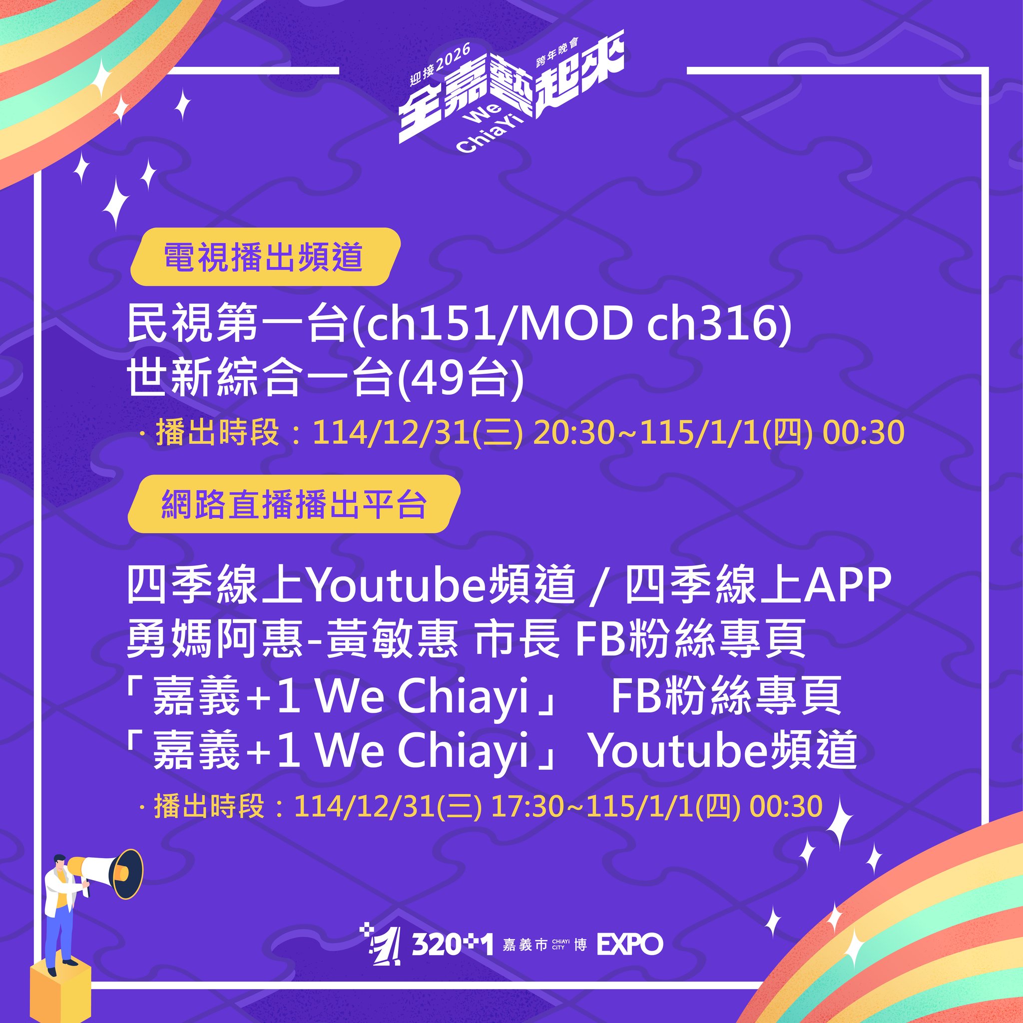 今年嘉義市跨年晚會會在電視民視第一台(CH151/MOD CH316)、世新綜合一台(49台),網路平台黃敏惠市長FB、四季線上YoutTube/APP、嘉義+1 We Chiayi FB/YouTube 轉播,在家也可以線上收看。