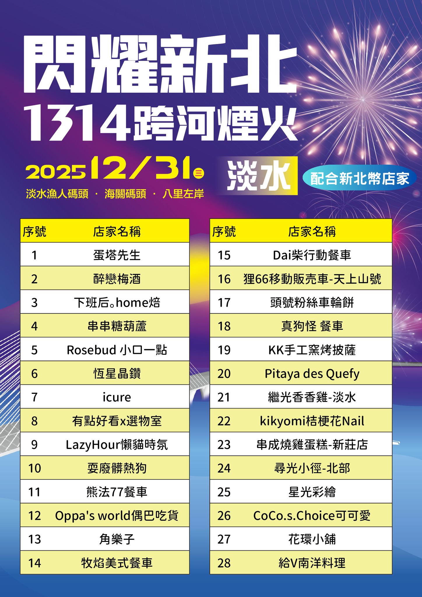 這次跨年煙火將搭配淡江大橋上的光束演出,透過這場光、影、聲「橋河共演」樂章,讓世界看見新北,並為 2026 年揭開璀璨序幕。