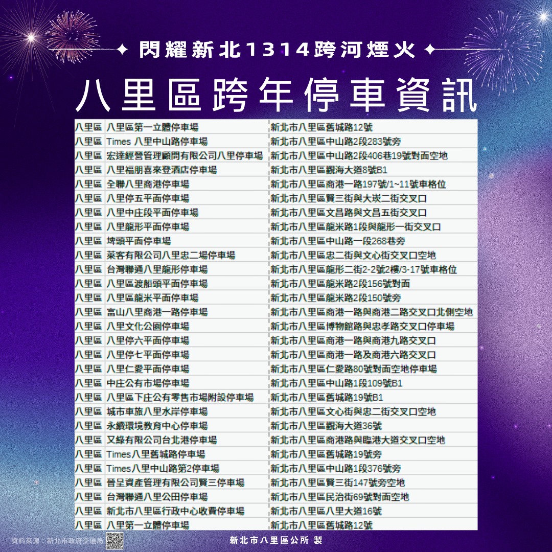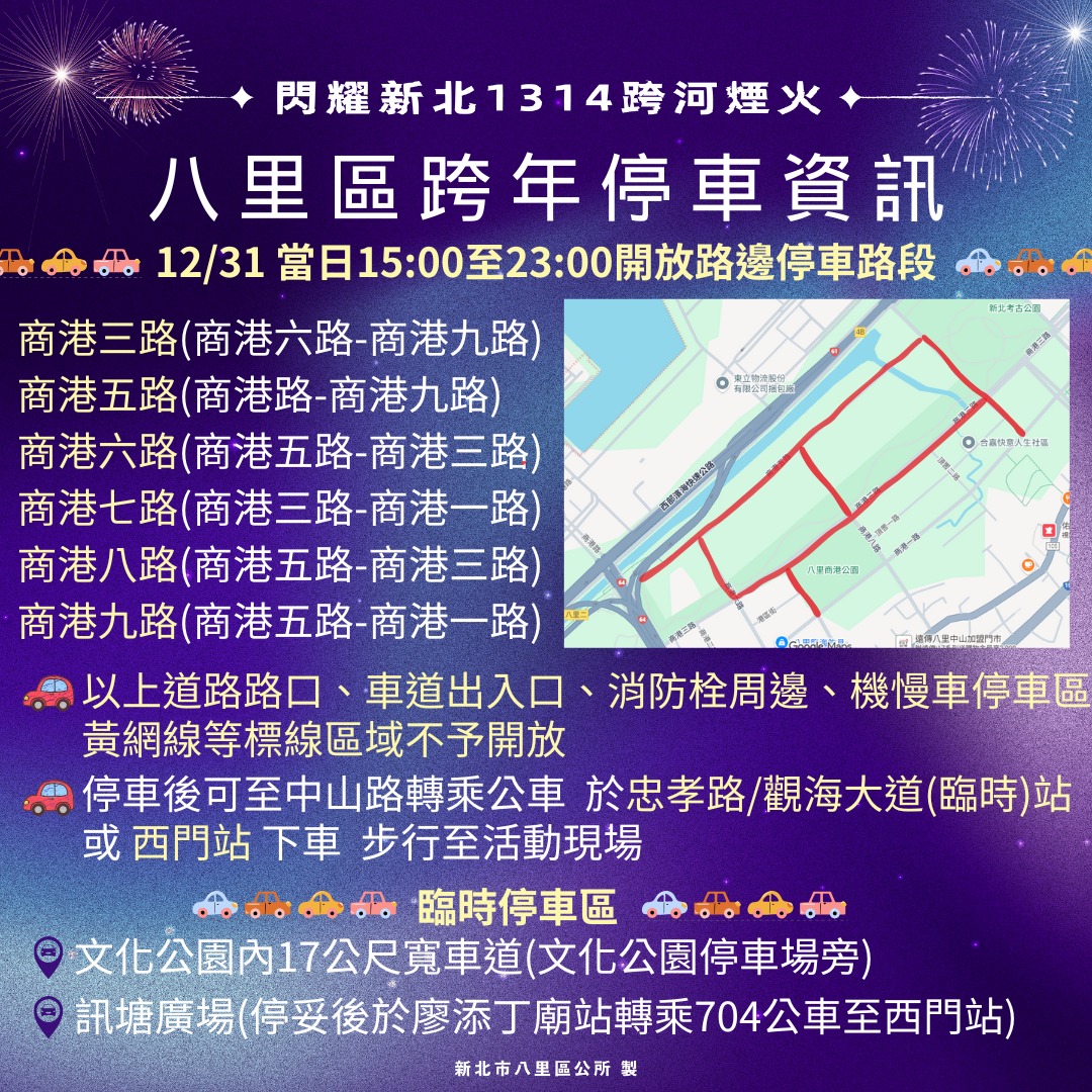欲前往八里的朋友,以下路段將於 12/31 15:00-23:00 開放路邊停車,有瘀校的民眾不妨多加利用。