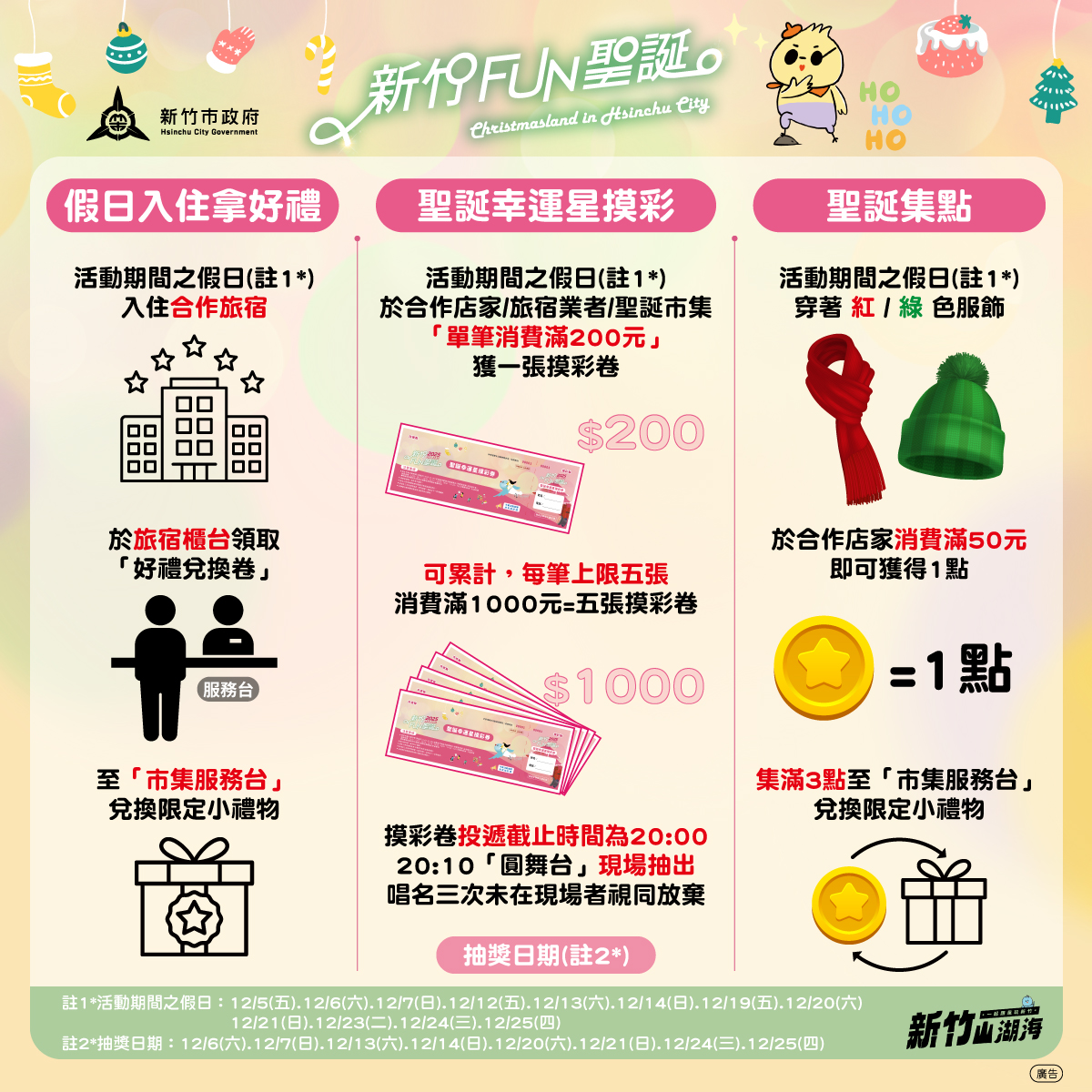 穿紅色或綠色衣服到新竹市合作店家消費滿 50 元,可參加聖誕集點活動,集滿 3 點可換小禮物。