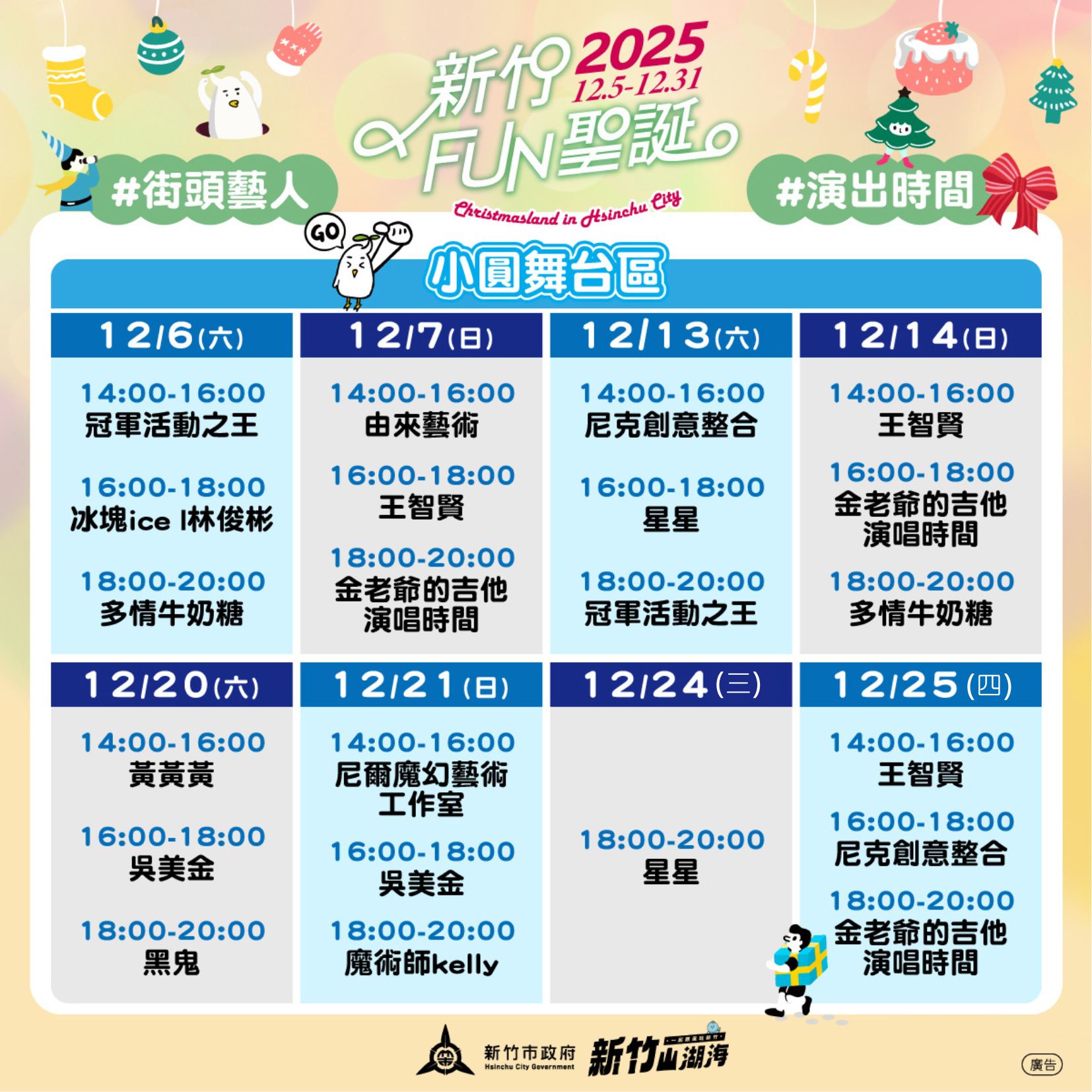 | 舞台表演 | 12/6(六)、12/7(日)、12/13(六)、12/14(日)、12/20(六)、12/21(日)、12/25(四)14:00-20:00 12/24(四)18:00-20:00 |