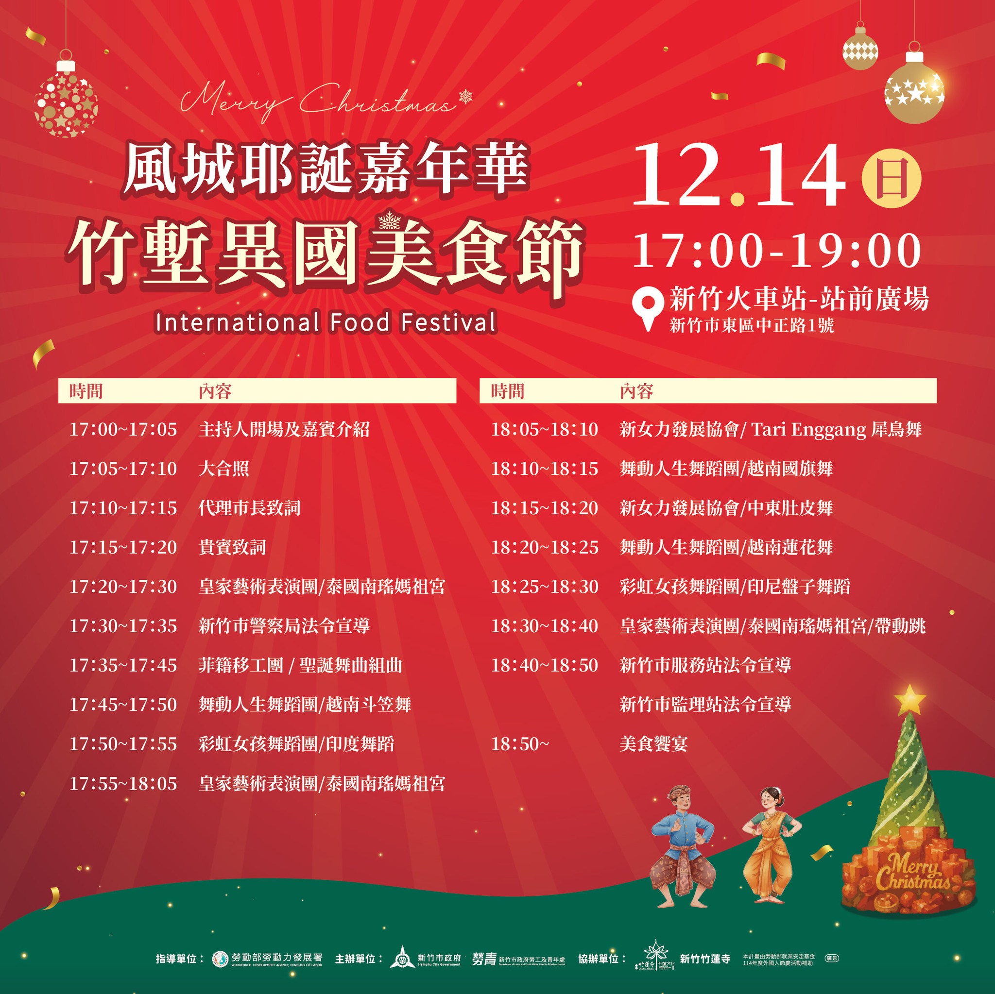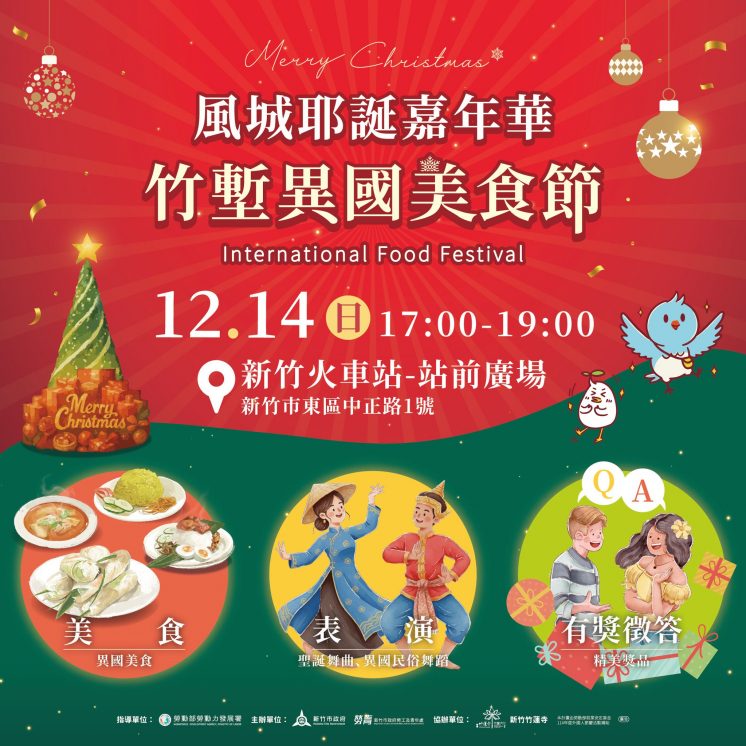 新竹市勞工及青年處舉辦的「風城耶誕嘉年華 竹塹異國美食節」將在 2025 年 12 月 14 日登場,現場除了有異國美食攤位,還有各國文化表演、有獎徵答,可以一起來玩。