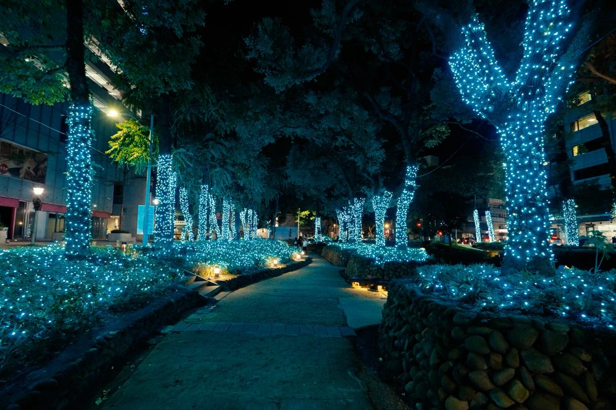 沿著護城河畔、圓環一路可見燈飾佈滿路樹與地下道,猶如地上星辰。